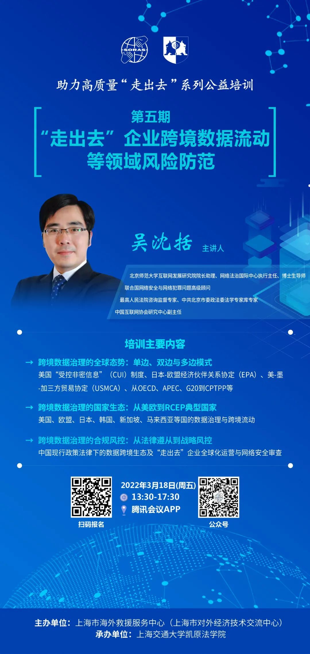 为助力企业在RCEP协定生效的大背景下,在“走出去”过程中进一步做好跨境数据流动等领域风险防范和权益保护,助推国际贸易中心枢纽能级跃升,加快构建新发展格局,在市商务委的支持下,上海市海外救援服务中心(市对外经济技术交流中心)将推出“助力高质量‘走出去’系列公益培训”第五期:“‘走出去’企业跨境数据流动等领域风险防范”培训,更好满足市场主体在“走出去”领域“行稳致远”的服务需求。