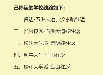 记者还从崇明巴士公交公司了解到,为配合上海疫情防控安排,自3月15日起,暂停e乘巴士崇明1号线和所有学校线路的运行。具体何时恢复营运,届时将另行通知。
