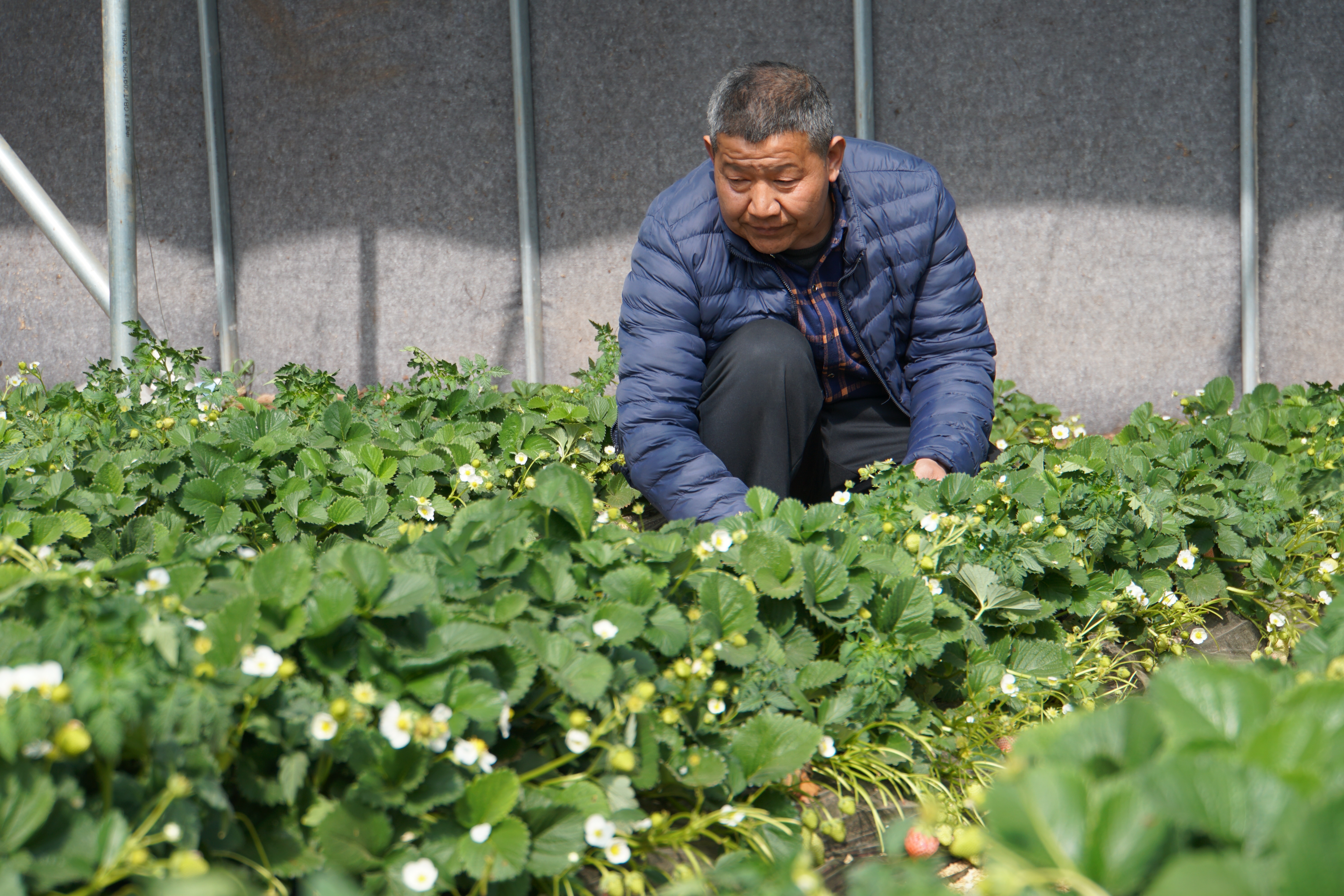 高长林在草莓大棚里查看草莓长势(记者 徐佳 报道)