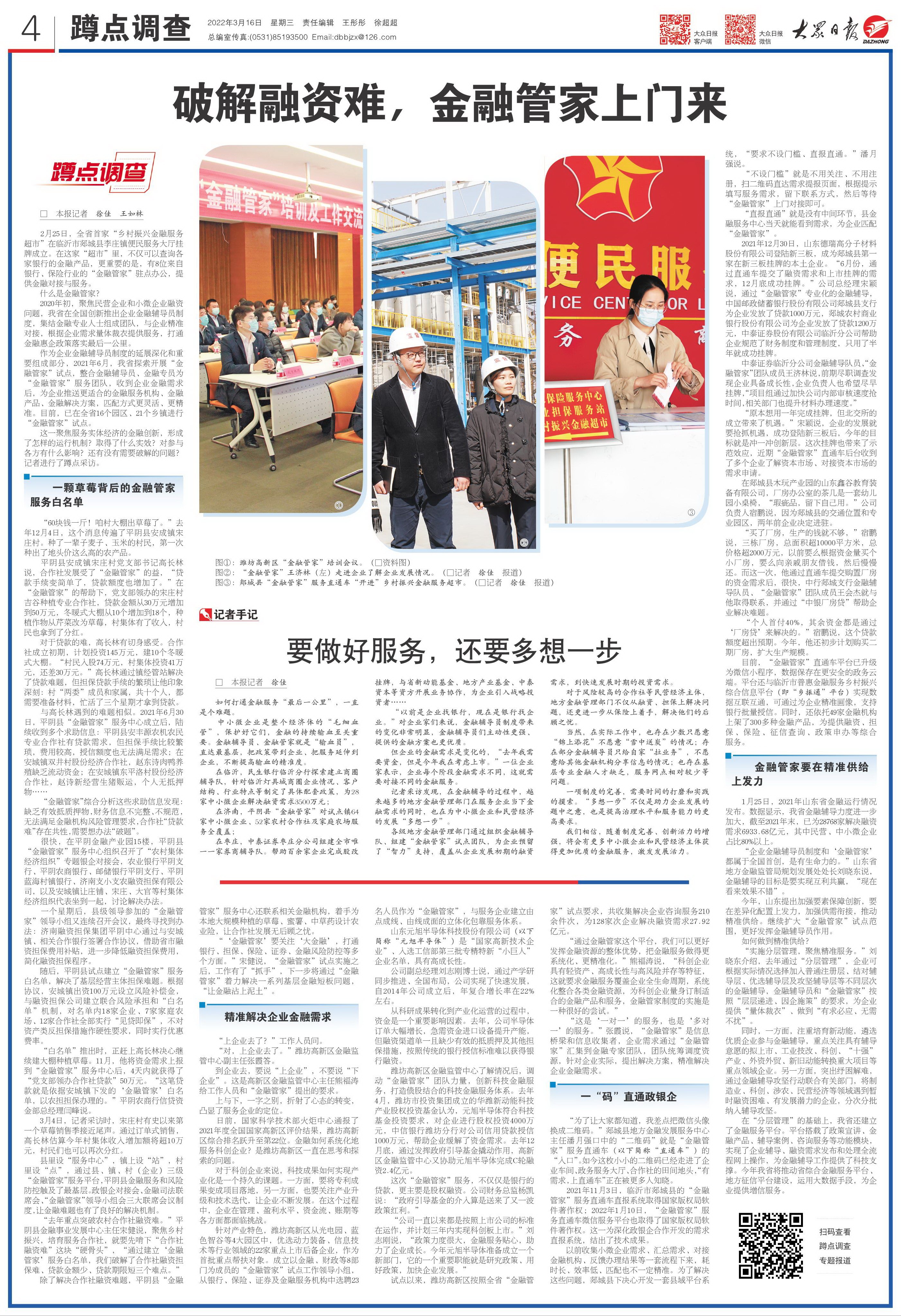 在济南,平阴县“金融管家”对试点镇64家中小微企业、52家农村合作社及家庭农场服务全覆盖;