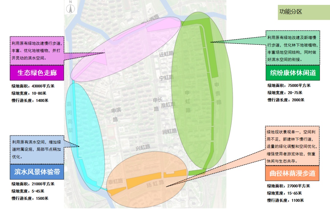 这一段也是新虹环社区绿道的滨水风景体验带。全长6公里的新虹街道环社区绿道已经建成,沿申贵路绿地展开,北至天山西路,往西至北横泾河道,一路沿河道向南至扬虹路,再往东延伸到申贵路形成闭环,为周边居民、白领提供了景观优美、宜游宜憩的场所。