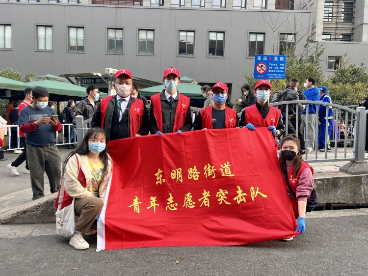 东方医院南院作为东明地区的一座大型医院,在这波疫情中承担了很大的核酸检测任务,不仅有根据防控要求前来定点检测的人群,还有自行前来检测的周边居民。为此,东明路街道多个职能部门联合发起了疫情防控青年志愿者招募令,组建了这支青年突击队。