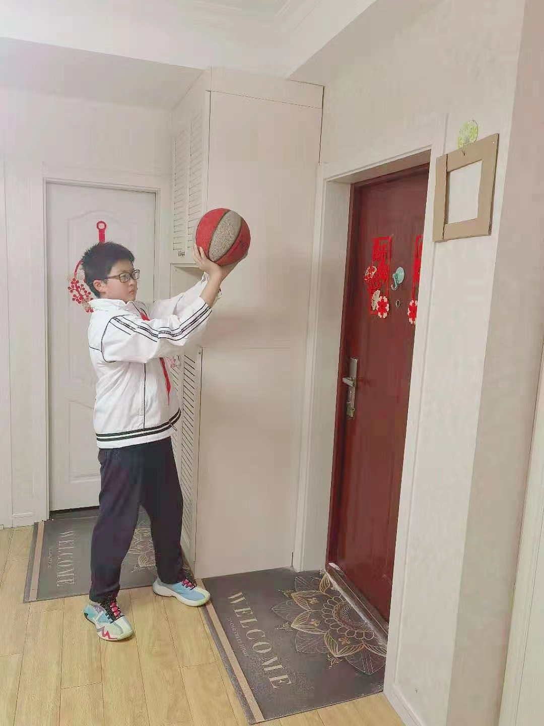 “不到球场也可以投篮!”上外云间中学六(3)班学生熊皓将篮球场搬到了自家客厅一角,在墙壁上“设计”出了别样的篮框。他说,用一个个高低不同的方框模拟篮板,由低到高、由远到近进行练习也能达到练习投篮的效果。
