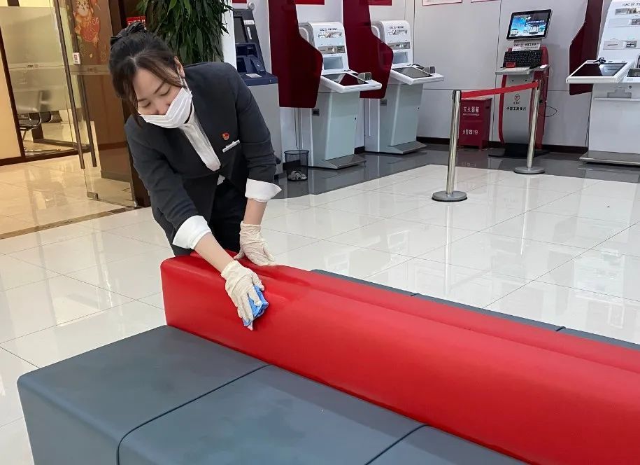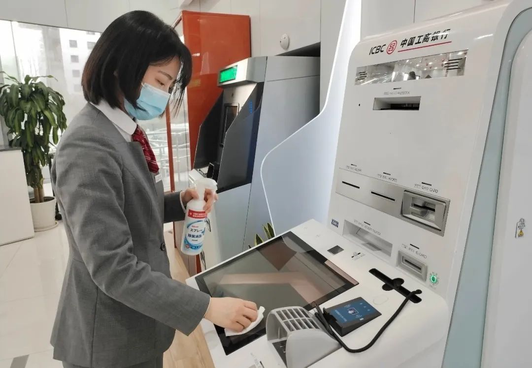 ▲ 浦东开发区、嘉定支行辖内营业网点对自助机具、厅堂设施、业务柜面等区域场所进行全面消毒杀菌。