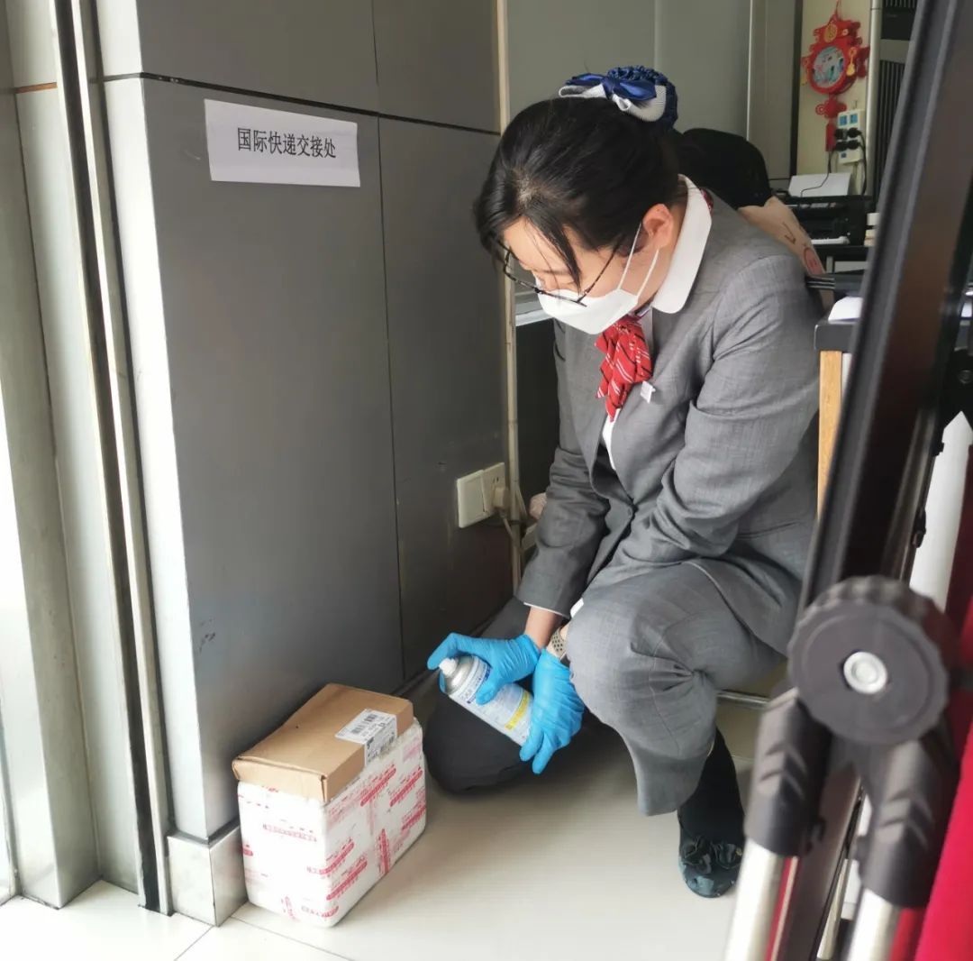 ▲ 漕河泾龙漕路支行员工仔细进行防疫排查,对国际快递等外部物件进行及时消杀。