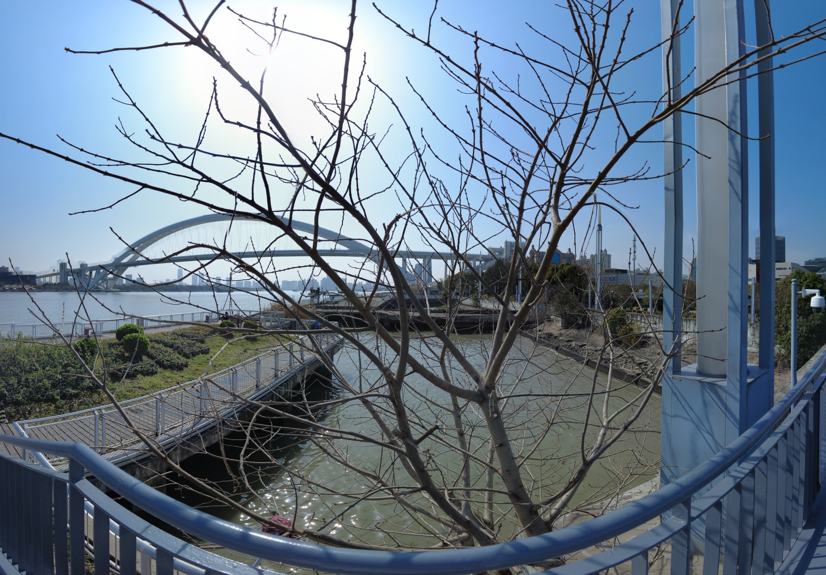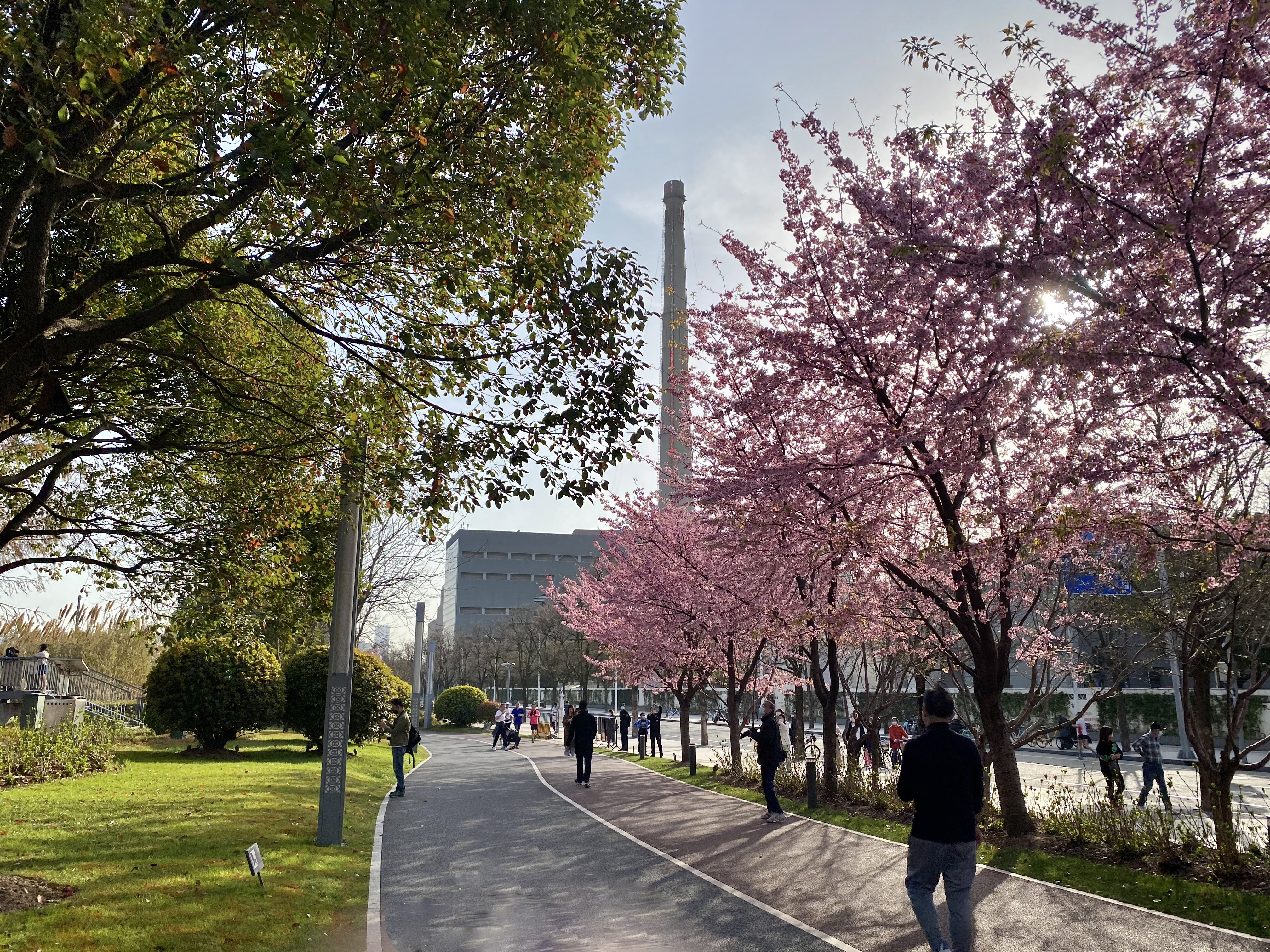 滨江一路爆炸的樱花和远处的大烟囱、来往的人们、绿色的草坪、斑驳的树影形成一幅自然流畅的速写。人烟稀少的小桥流水,树杈在微风里摇曳着。它们静静等待懂得欣赏的路人经过,不徐不慢,且耐心等待着。