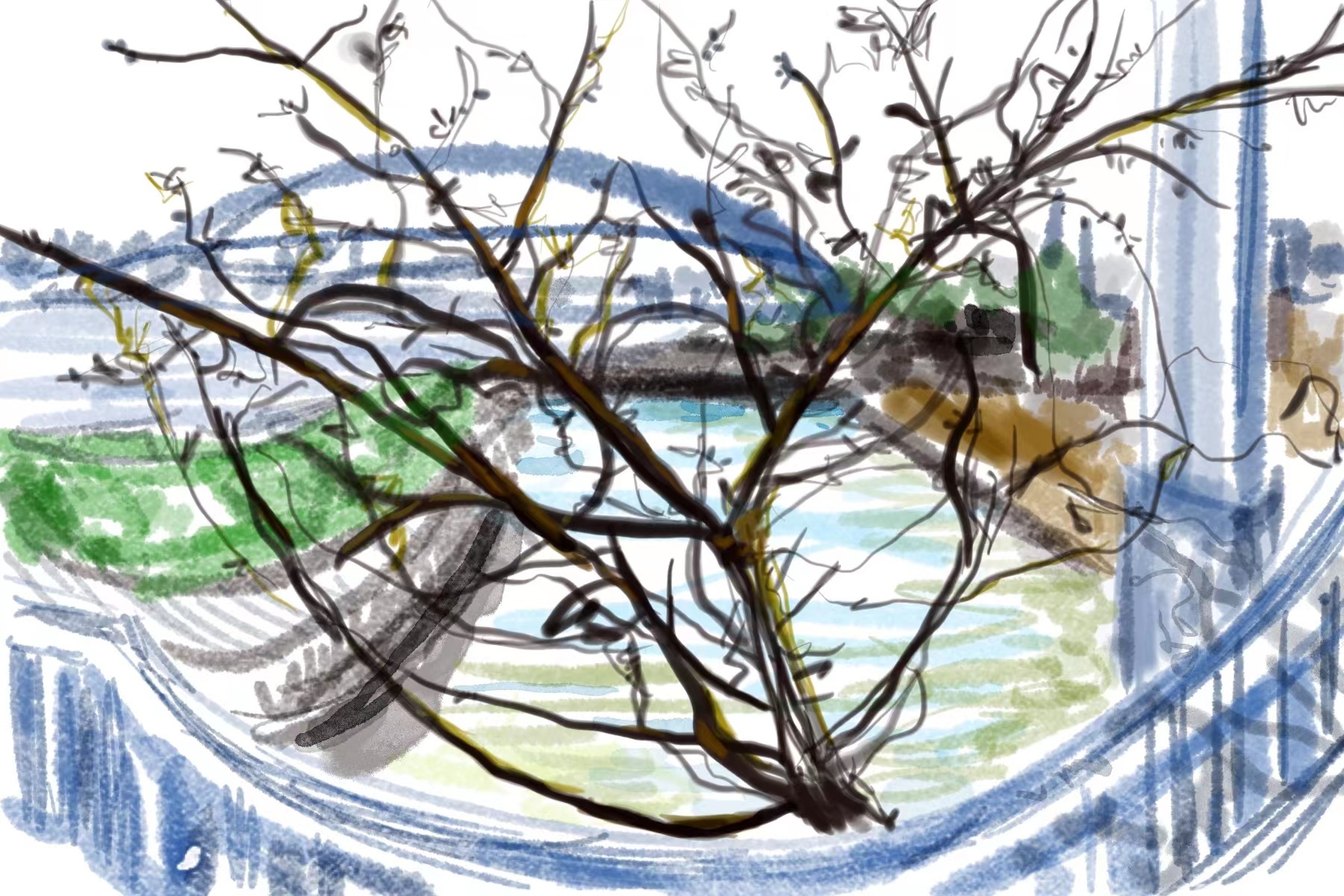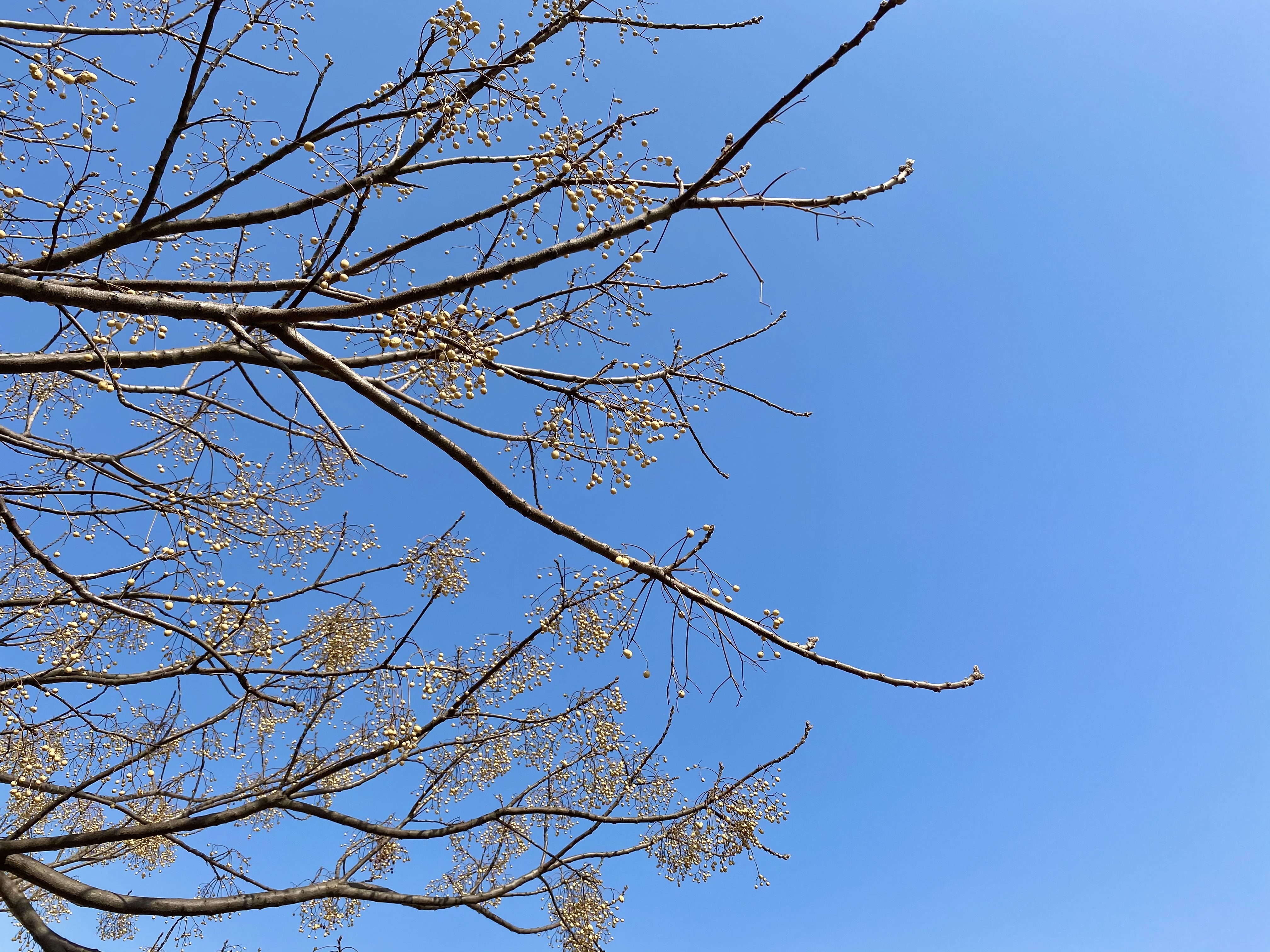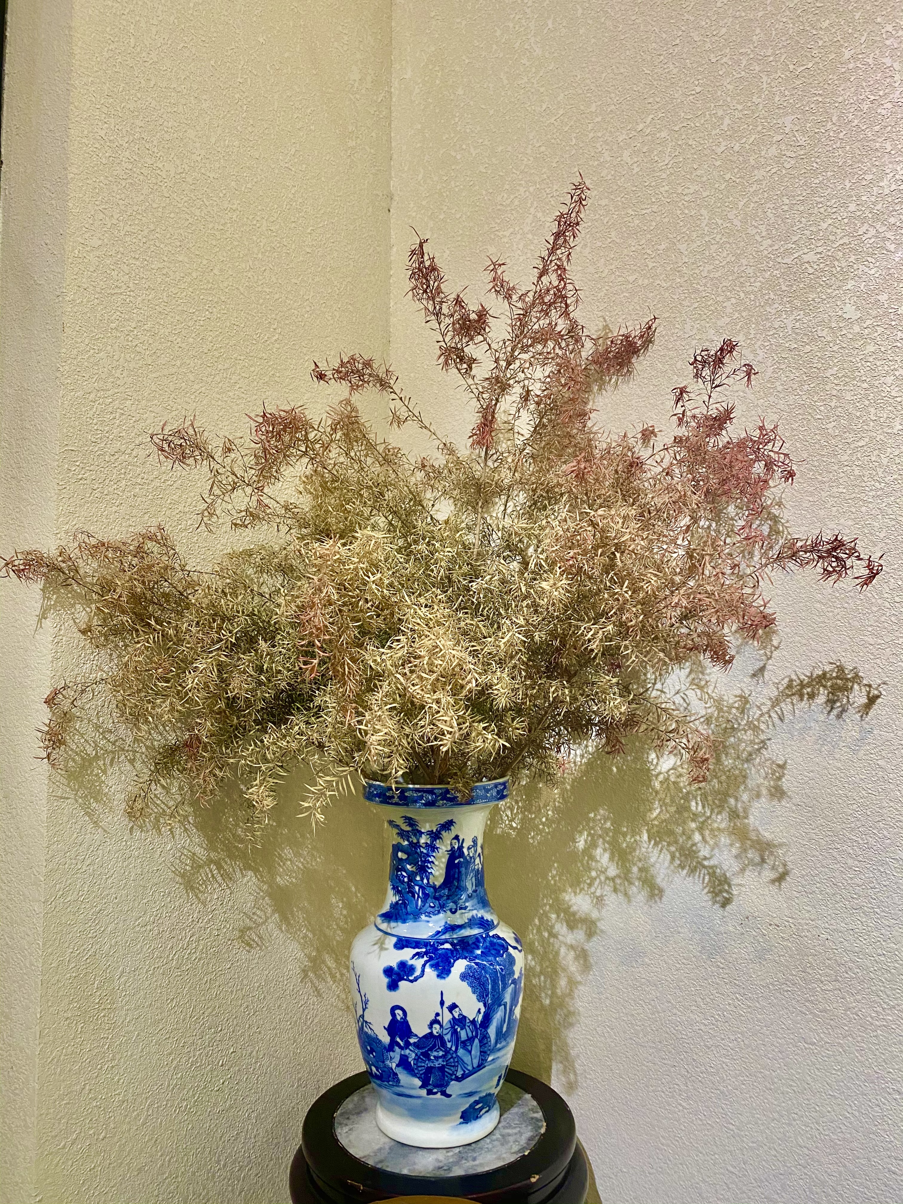 就算宇宙纷扰,它只需管好在窝里的一隅天地独自快乐。青花瓷里逐渐干枯的树枝,颜色从浓郁系蜕变成莫兰迪色。排列有序、长着很多果子的不知名小树,在淡蓝色天空的映衬下自成一张手机壁纸。