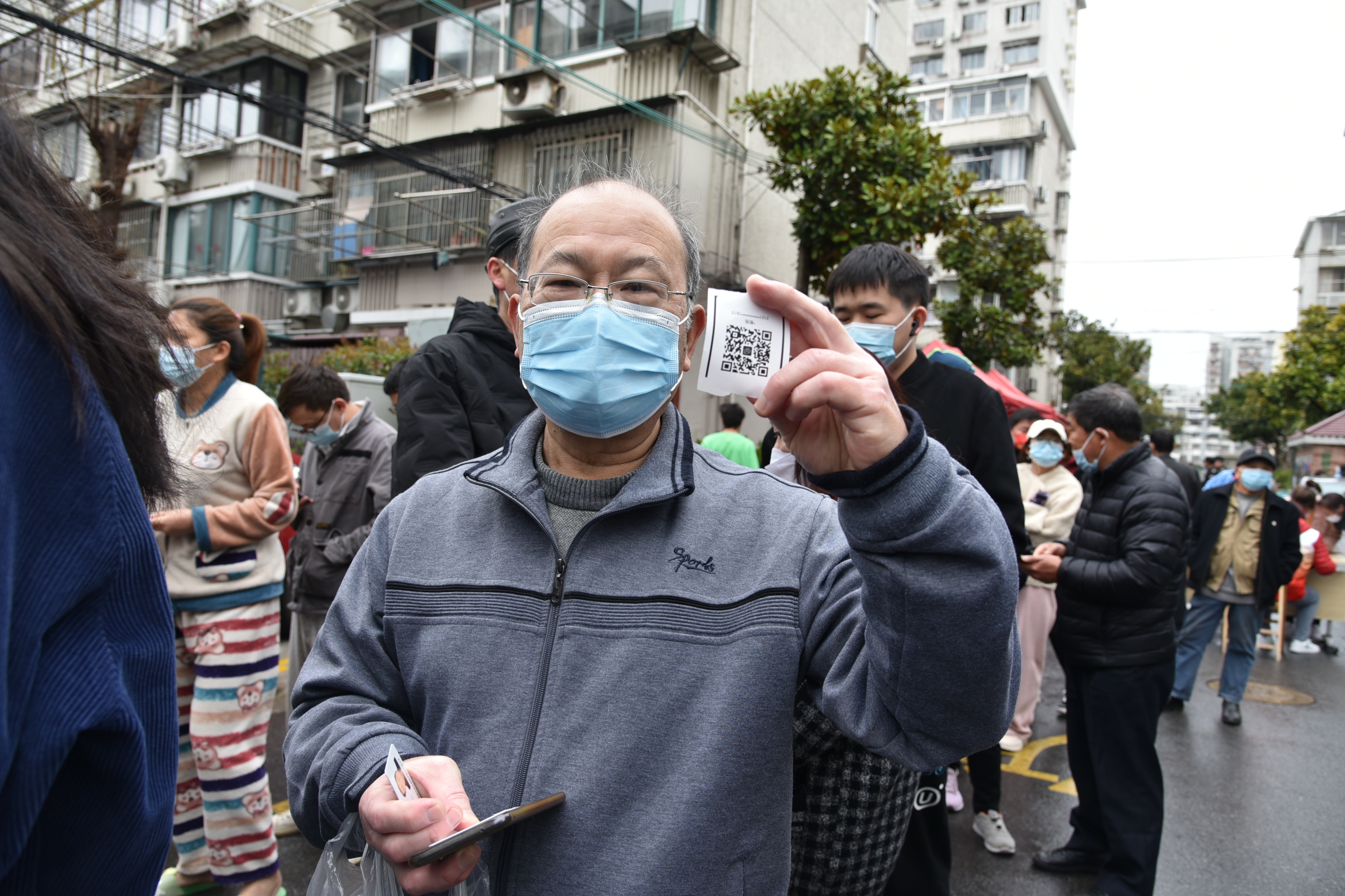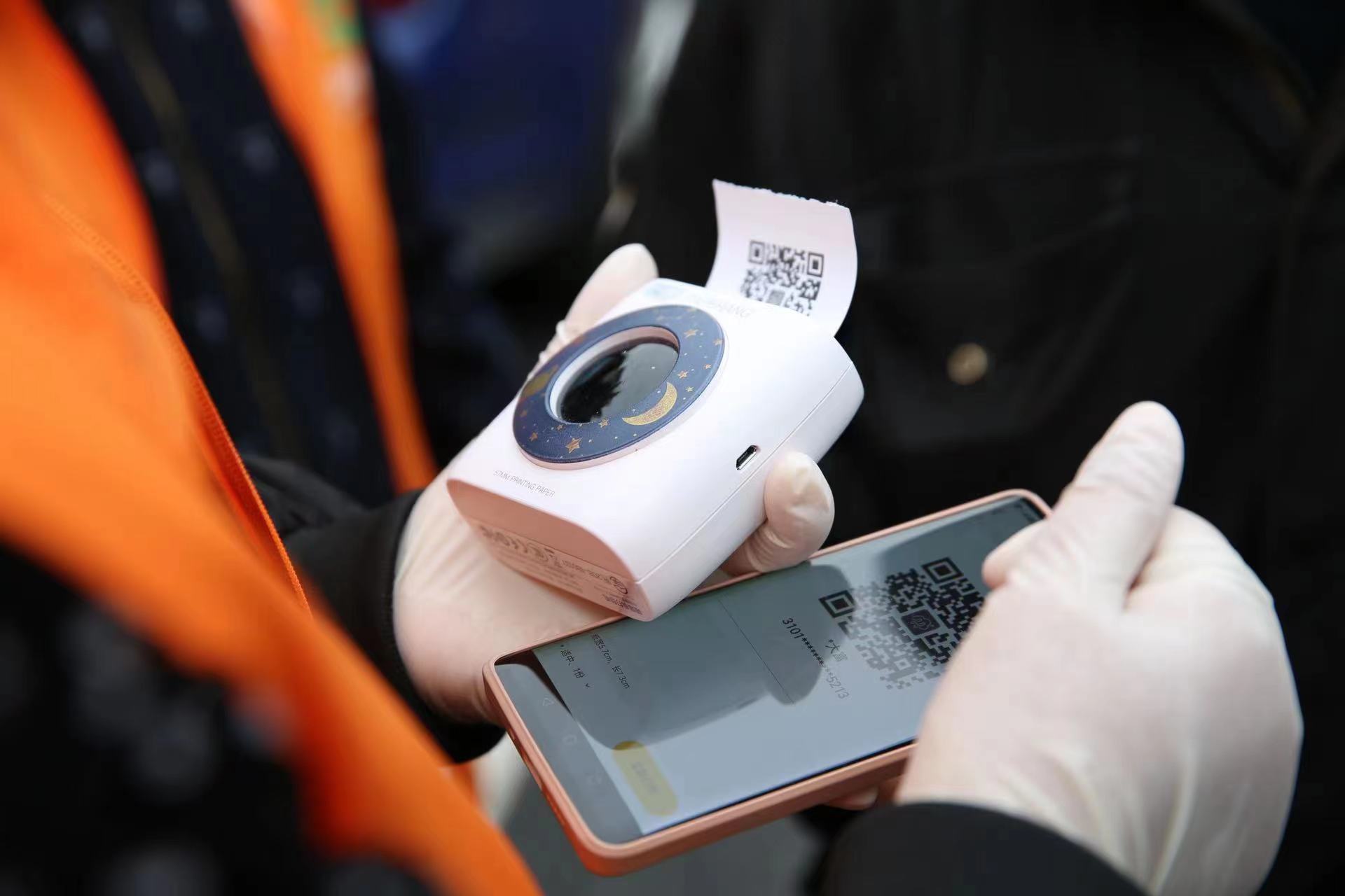 周师傅和老伴一听到志愿者的“小喇叭”里喊到自己居住的楼栋号就立刻下楼,根据指引排队等待检测。由于两位老人用的都是老人机,志愿者特地将老人引导到“喵喵机”点位,熟练地帮助老人完成核酸检测登记后,利用手里的“喵喵机”将登记二维码打印出来,再分别交到两位老人的手中。“先前居委会工作人员特地关照说,没有智能手机,带上身份证就行,我还在担心会不会影响检测。没想到志愿者帮忙登记这么快,还当场就打印出来,太好了。”周师傅开心地展示起手中印有登记二维码的“小票子”。