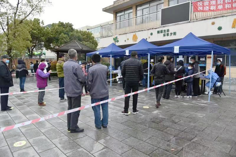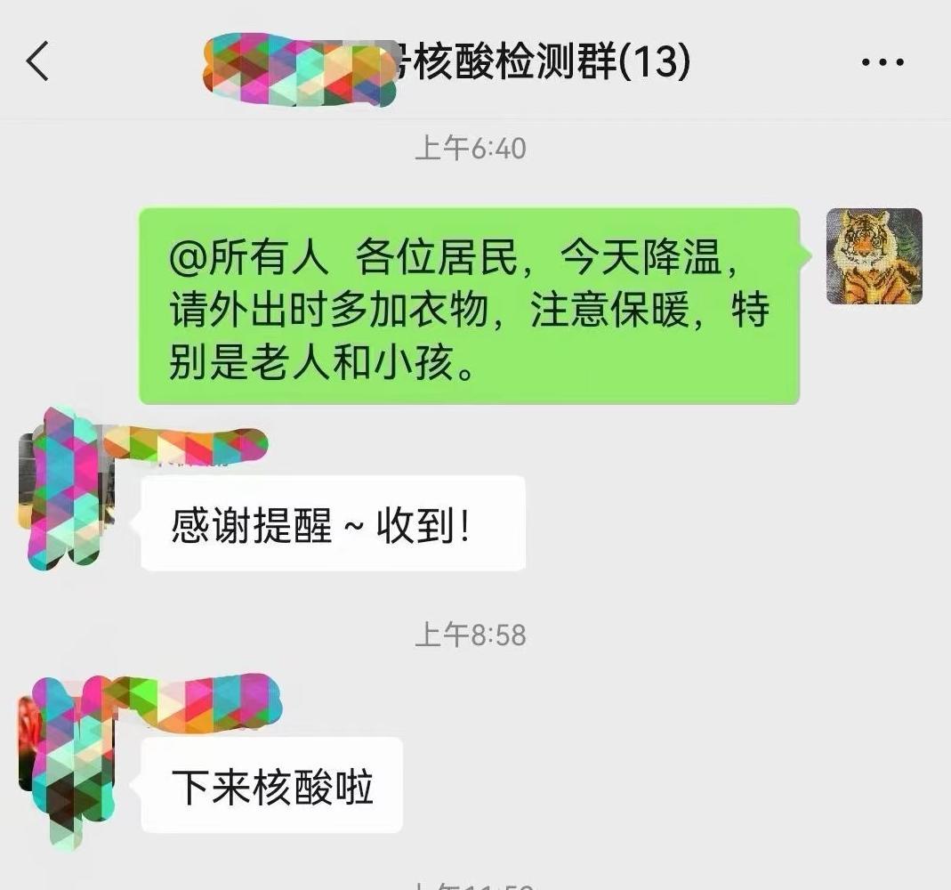 从下楼排队到完成核酸检测整个过程只需要10多分钟。为了实现这个检测速度,三泉路770弄小区居委会想出了“小妙招”:核酸检测前一天的晚上,给每个楼栋都组建一个“楼道群”,利用群消息通知楼内居民下楼进行核酸检测,既方便管理,又能够预防出现居民排长队、等候时间长的情况。“各位居民,今天降温,外出时请多加衣物,注意保暖,特别是老人和小孩。”提醒居民注意保暖的群通知更是让居民倍感暖心。