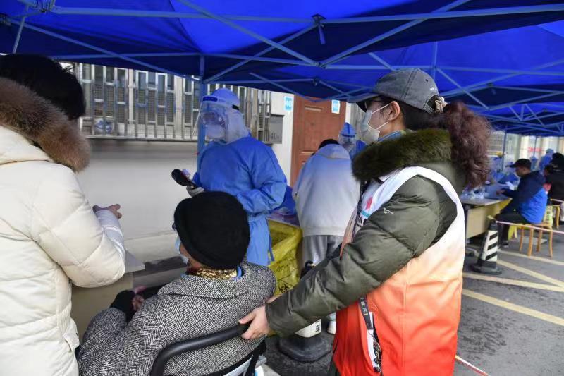 在平顺小区,各个检测点位现场都井然有序。志愿者们按照楼道叫号,将居民分流至6个点位进行核酸检测,减少排队等候时间,加快检测速度。为了尽可能缩短老年人以及需要在家上网课的学生们的排队时间,小区还专门开辟出“绿色通道”。