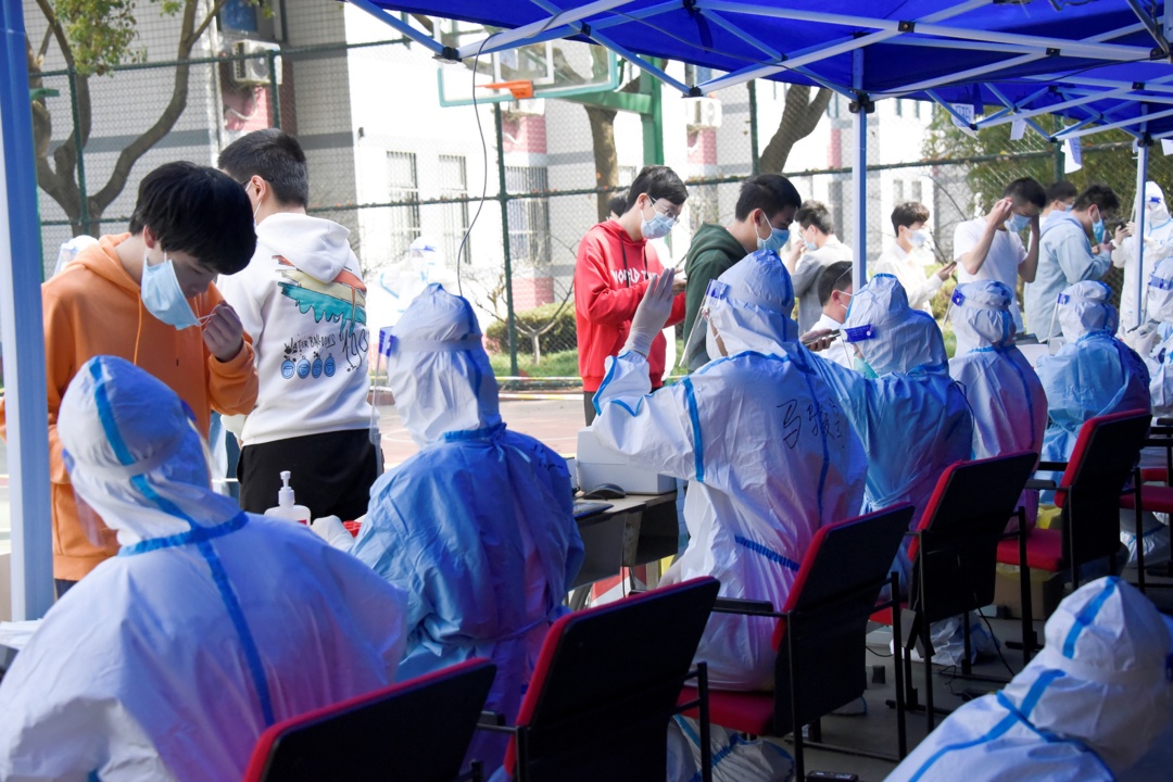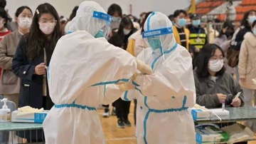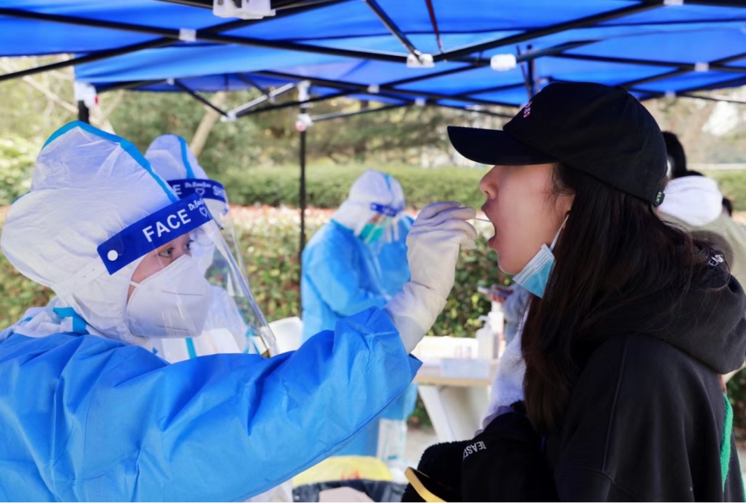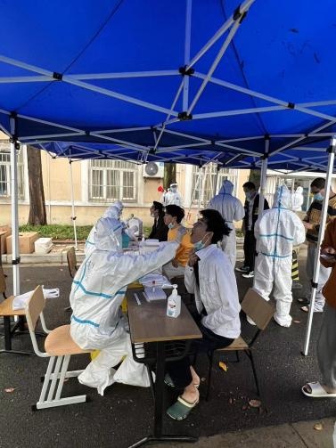 来自复旦大学各附属医院的“大白”连续两天为师生做核酸检测。在春日温和的阳光下,她们的脸还是被晒红了。从她们专注检测的眼神中,我们也看到了疲惫。然而,她们还是坚守在自己的岗位上,高高扬起示意大家往前来检测的手势,不禁令人动容。