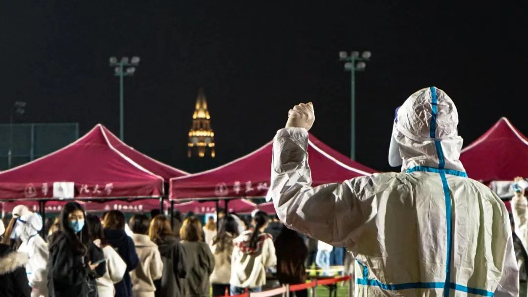 23点30分,奉贤校区全校核酸检测工作完成,退役士兵志愿者和大学生志愿者们排成方队,向在场的“大白”敬礼致谢。疫情就是命令,白衣就是战袍,医生护士就是战士,一声声“辛苦了”让所有人红了眼眶。