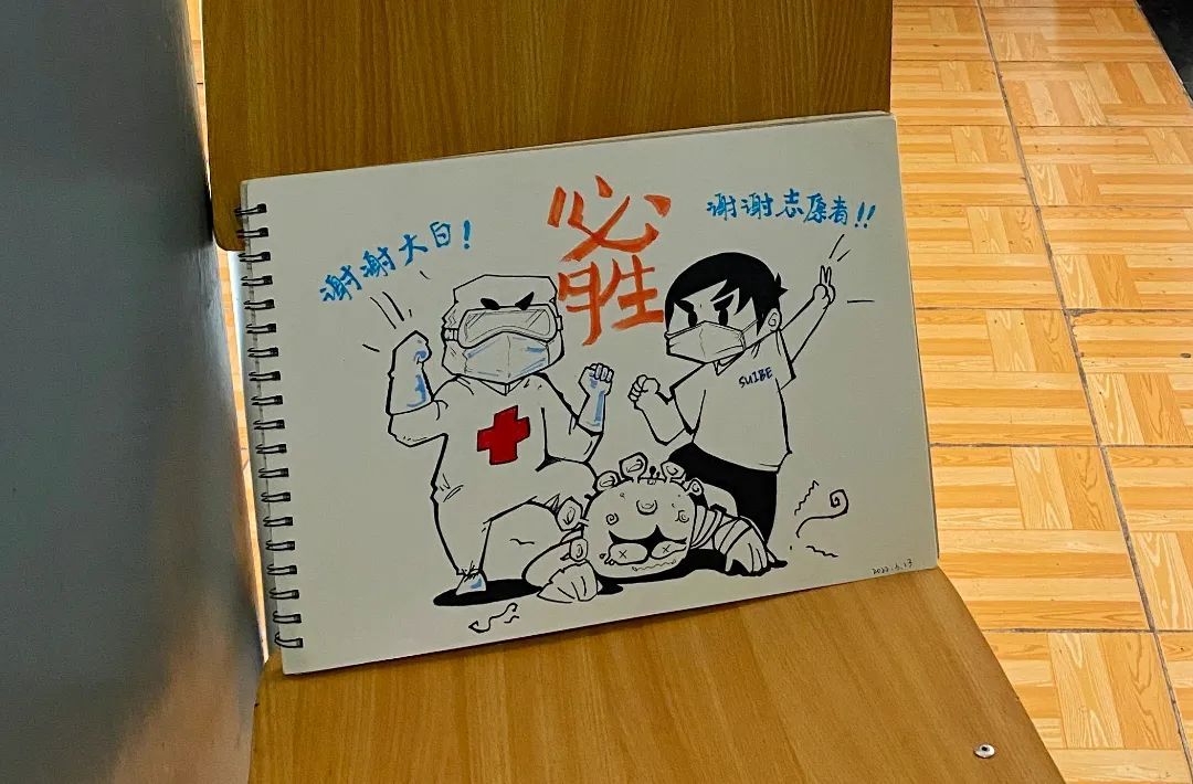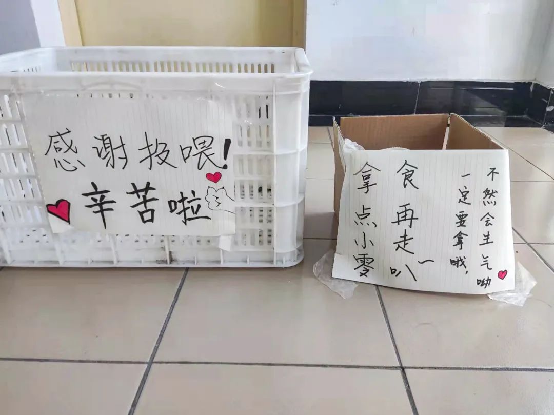 为了感谢“大白”、志愿者们的服务,有的宿舍门口立起了加油鼓劲儿的欢迎漫画,有的宿舍门口摆放了供“大白”自取的零食箱,每个人都在为度过这段特殊时期而出一份力,向抗疫一线的“大白”们致敬!