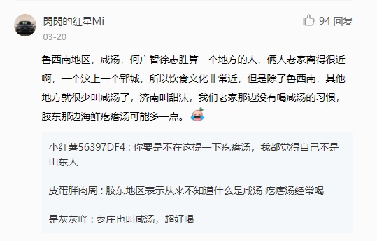 有趣的是,在评论里,不少山东网友说“喝过咸汤,确实很好喝”,也有山东网友表示“从来没听说过”。
