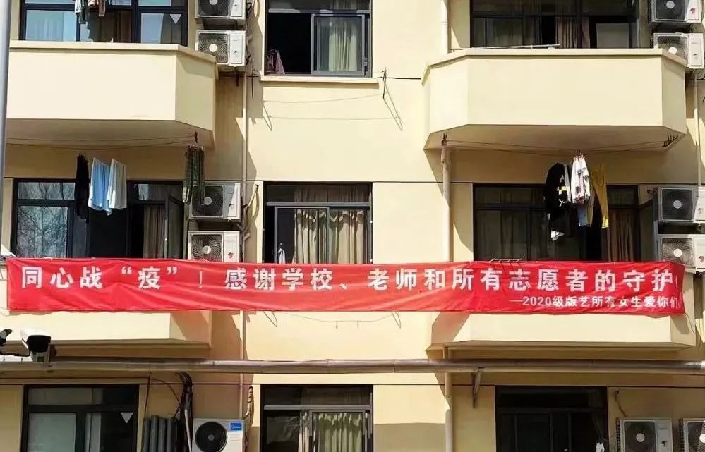 这条横幅是同学们自发制作的,表达战疫决心以及对学校的爱。从想法到落地,只用了两个小时,期间各班积极响应众筹,男生代表将做好的横幅送来宿舍楼,女生们则纷纷在横幅上签下名字,“也是一种相互鼓励,我们约好疫情后一起踏青!”