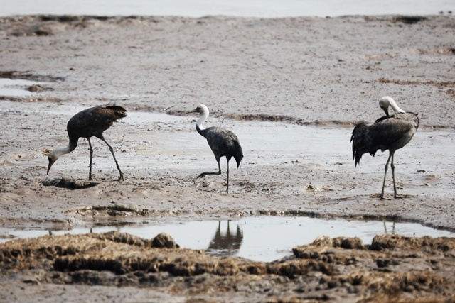“我们在滩上看到的主要是各种各样的鸻鹬类,有黑腹滨鹬,有一些少量的大滨鹬,还有一些环颈鸻、金眶鸻等等。”说起保护区内的鸟类,冯雪松如数家珍。行进在大堤内侧的道路上,他突然有些兴奋地压低声音说:“今天运气不错。”随即把发现指给我们,只见远处的滩涂间,三只优雅的鹤正从容地觅食,正是大名鼎鼎的白头鹤。