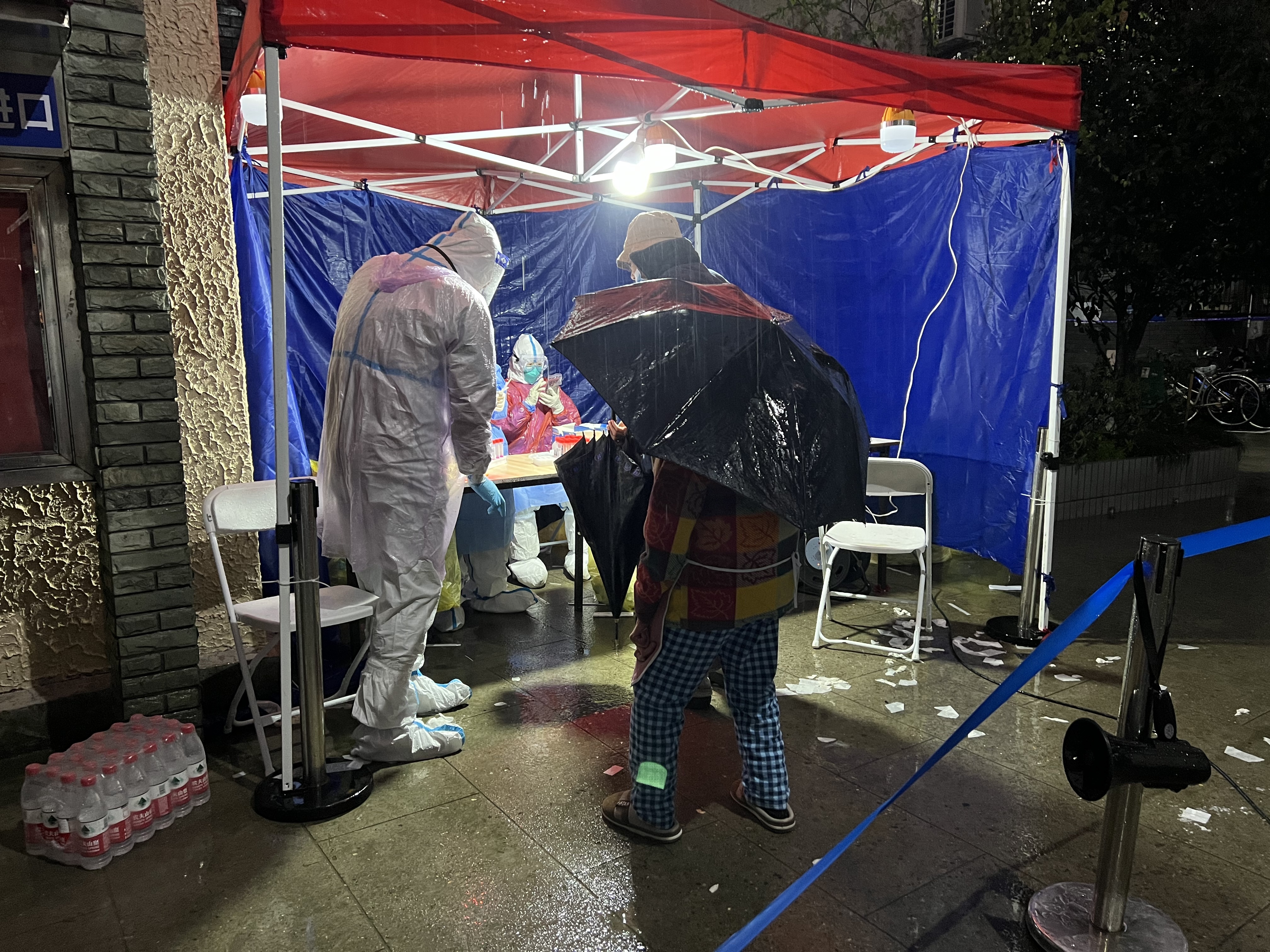 在第一、第二轮采样的两天时间里,气温突降到十度以下,第三轮采样时,天气更加糟糕,风雨交加,医务人员从白天到黑夜翻班执行,体力消耗巨大,“鞋子湿透,衣服湿透,早已分不清是汗水还是雨水。”一位“大白”感叹道。