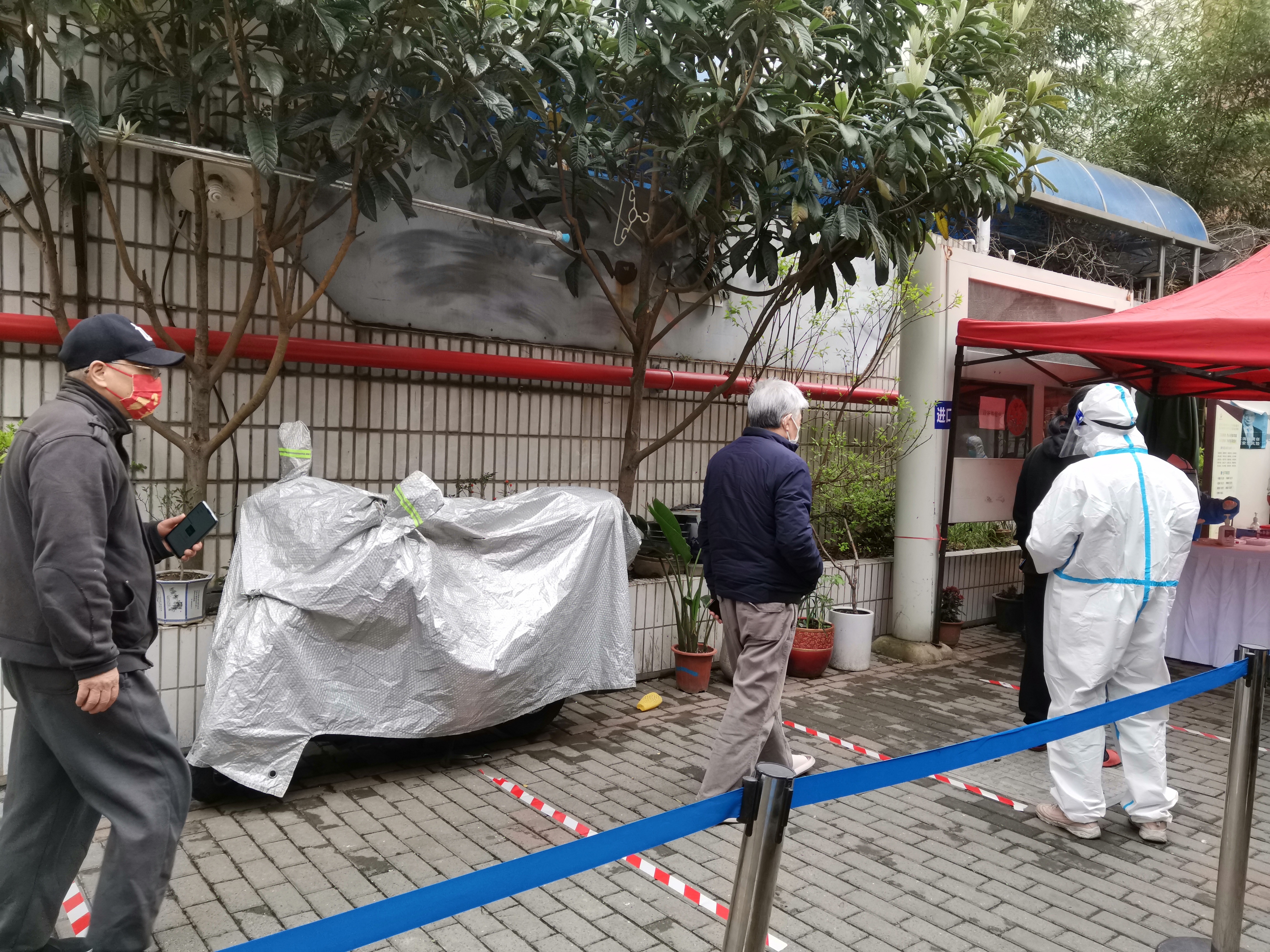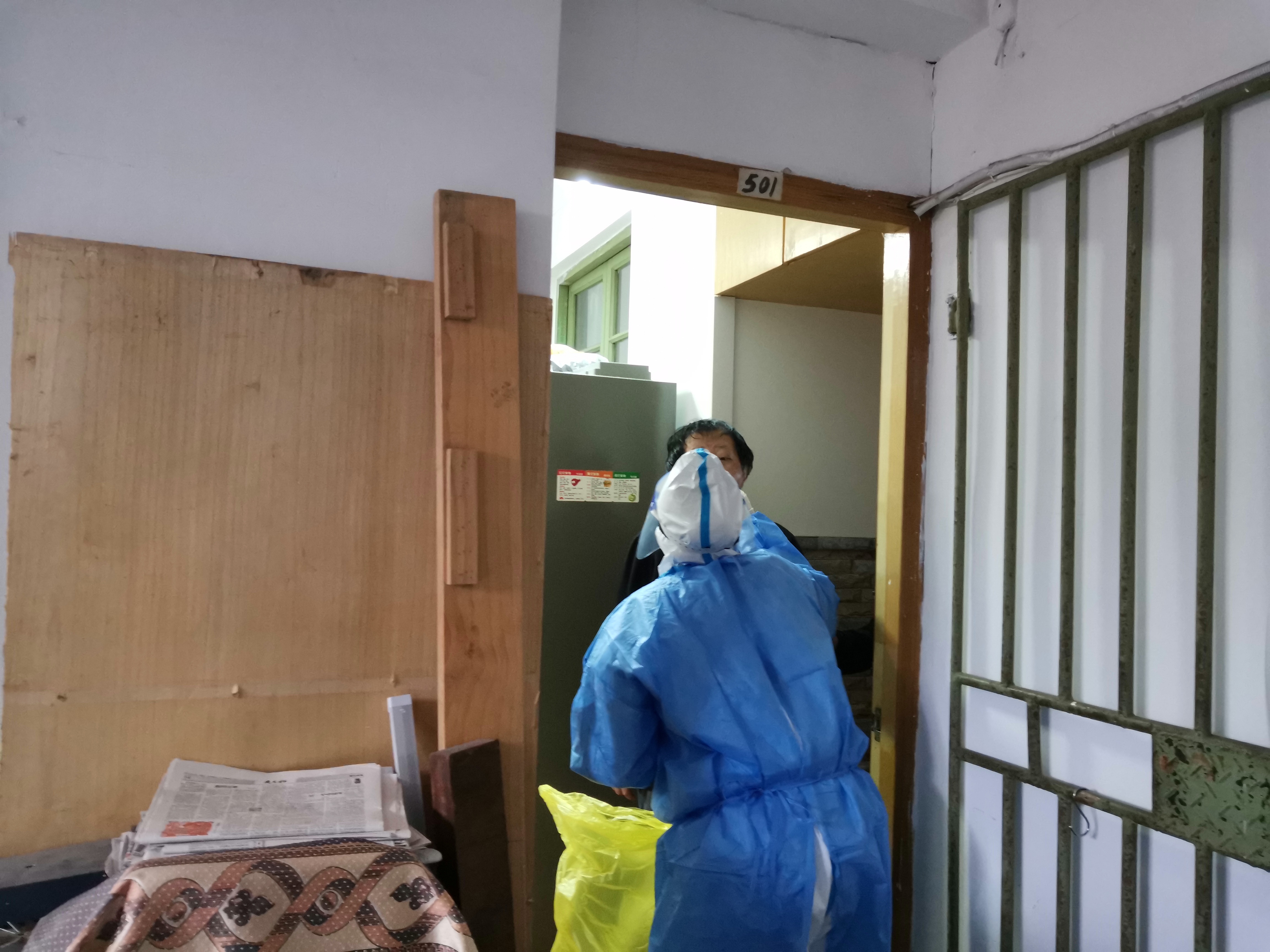 考虑到小区里卧床、行动不便的老年人较多,医务人员每日穿着沉重的防护服上门采样。今年83岁的居民谢阿婆对记者说,“他们真的非常不容易,一上门就是十几人,一趟跑下来,穿着大白的医务人员都气喘吁吁,我看着都很心疼。”