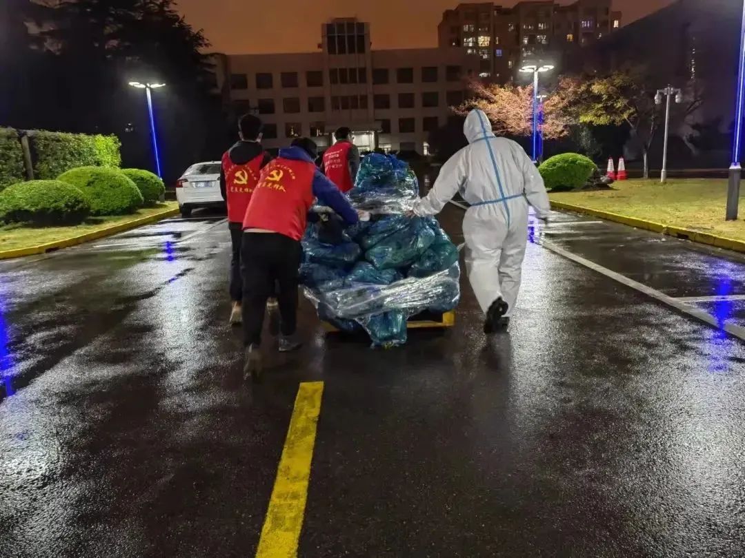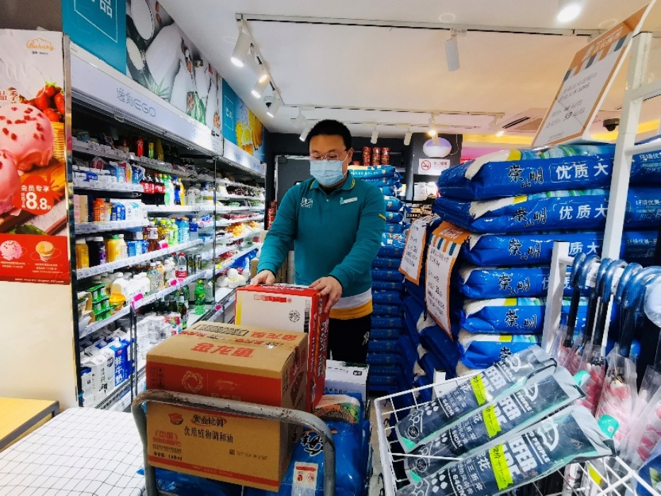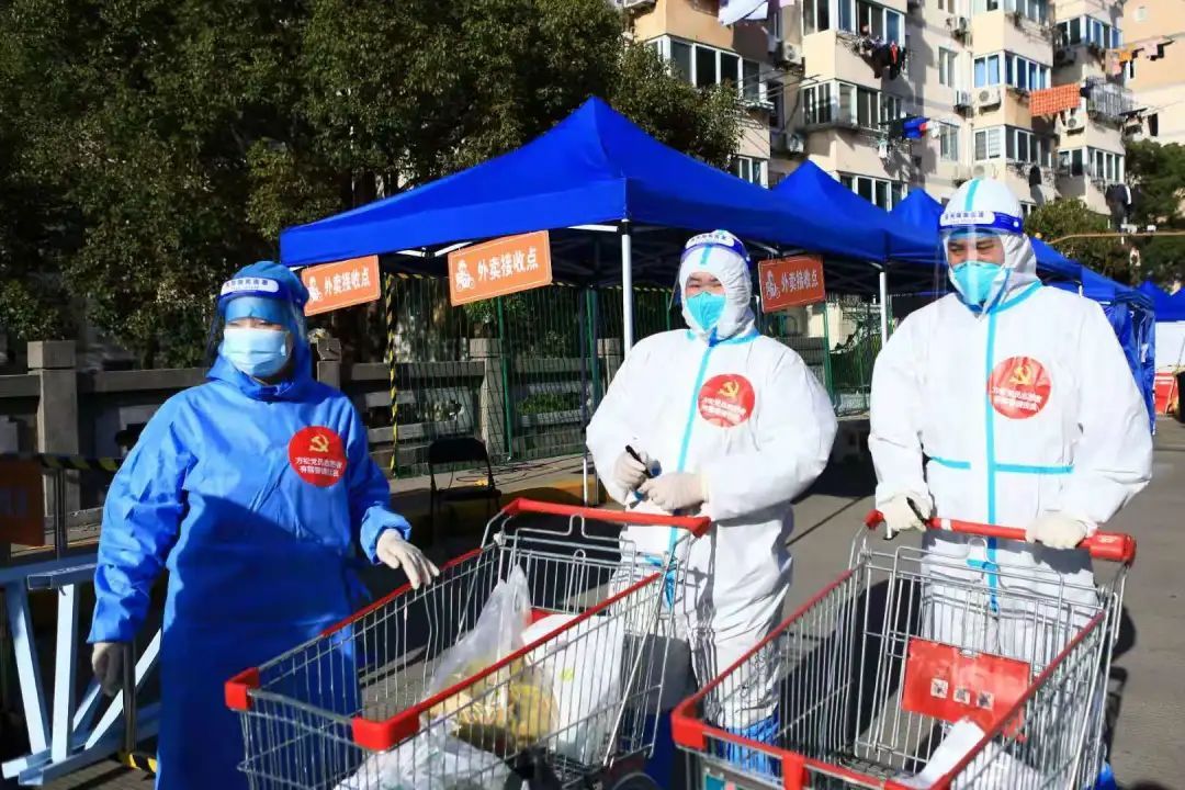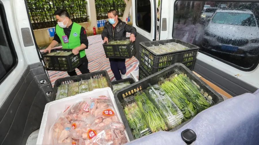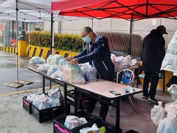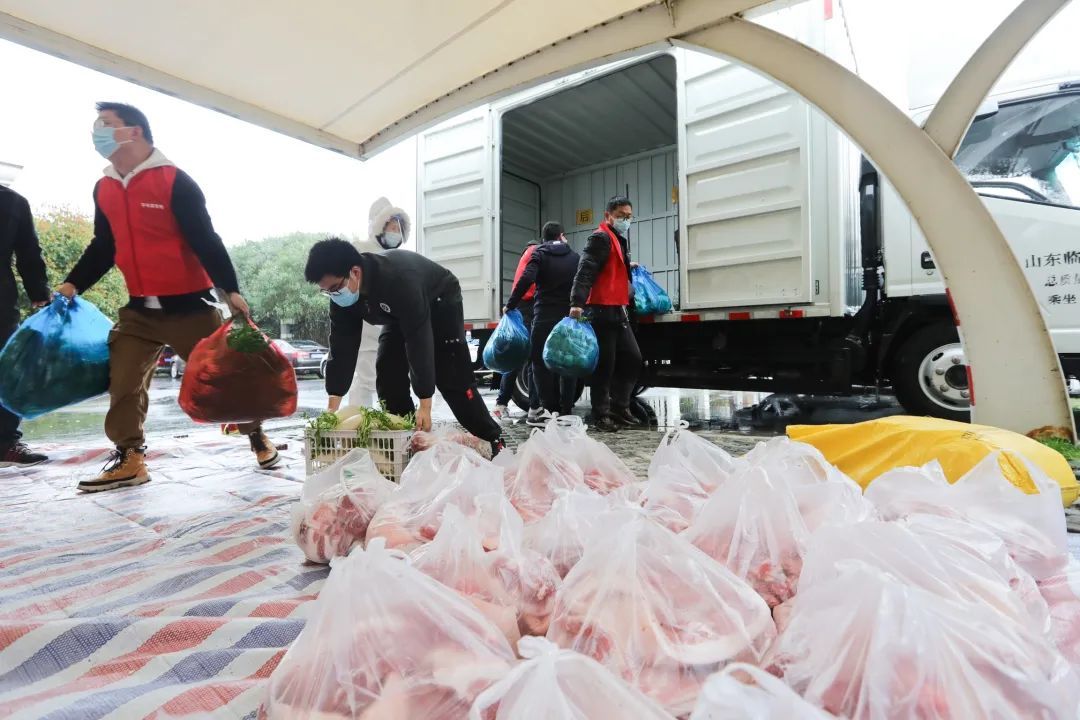 为克服配送人员不足,浦东新区调配250名区镇两级机关干部作为志愿者分拣配送由浦商集团提供的肉类、蔬菜。分拣完成后统一由志愿者自驾交通工具送到小区门口,再由村居干部和社区志愿者在小区内配送。经过7个多小时的冒雨奋战,最后一批物资在居民晚饭前配送到户。