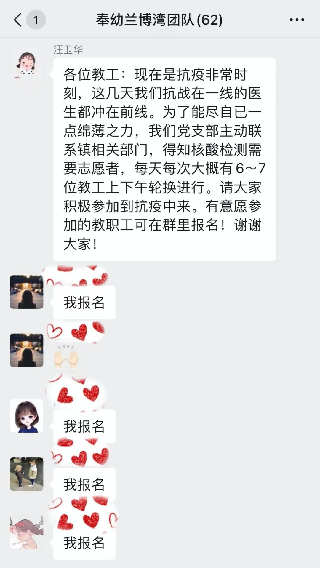 当地区直单位、社会组织、企业团体也纷纷为奉城战“疫”工作加油助力。3月14日晚,奉城兰博湾幼儿园园长汪卫华在工作群内向全体教职工发出疫情防控志愿者召集令,奉城兰博湾幼儿园和奉城幼儿园的全体教职工快速集结,以最短的时间组成了一支60多人的志愿队伍,支援疫情防控工作。