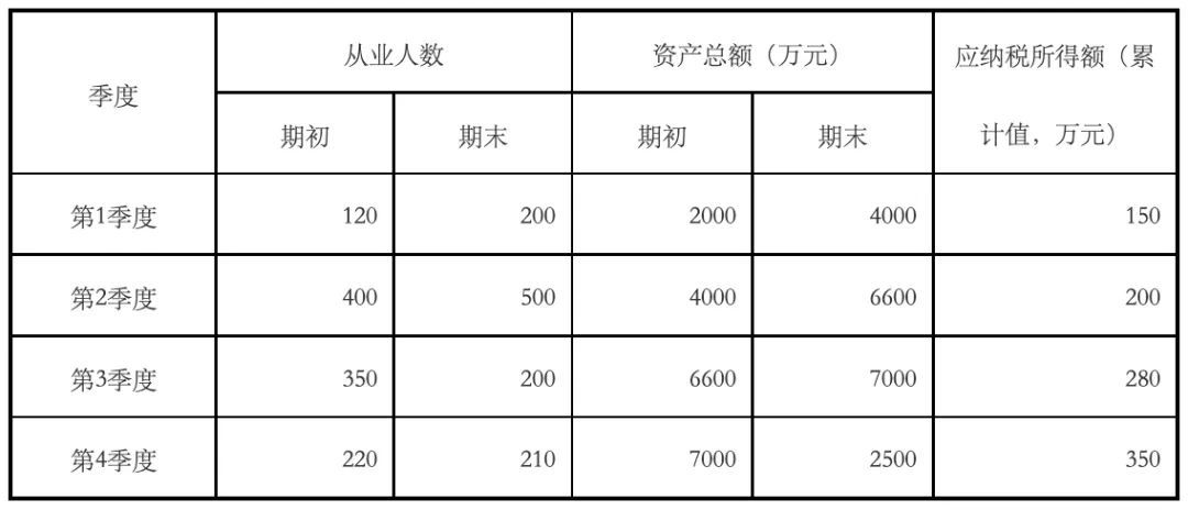 例1.A企业2020年成立,从事国家非限制和禁止行业,2022年各季度的资产总额、从业人数以及累计应纳税所得额情况如下表所示: