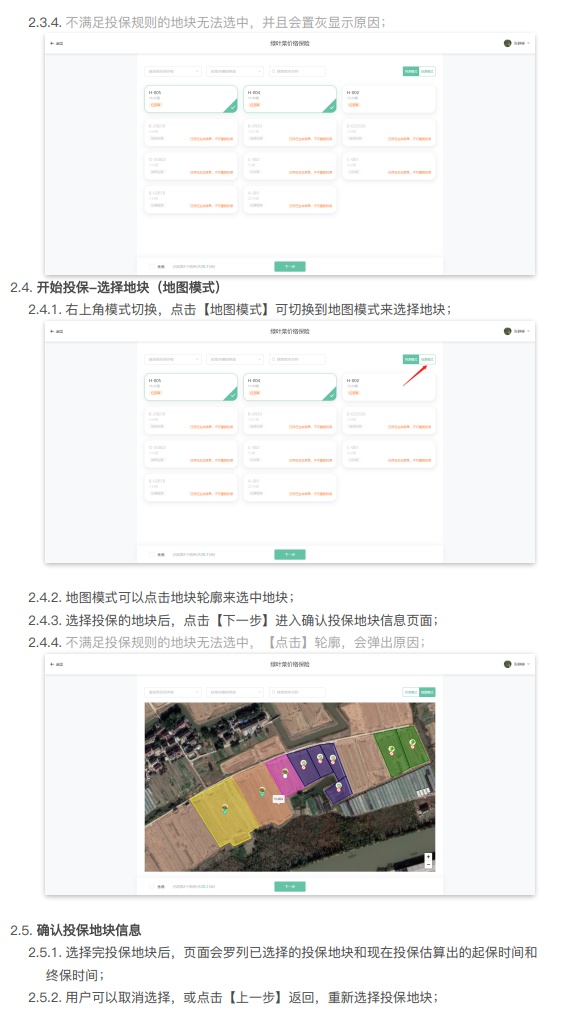 神农口袋与保险业务系统的打通不是简单的页面跳转,通过神农口袋的各种数据的汇集,系统可以自动计算并筛选符合投保的地块,农户可以通过列表或者地图筛选的模式一键全选符合投保的地块,并通过支付宝、微信、银行卡等方式完成投保金额的支付,大大简化了投保的流程。此外,当系统识别到农户所投保的地块触发了理赔条件,可以将保险理赔金额直接下发至农户登记的银行卡中,简化了理赔的操作。