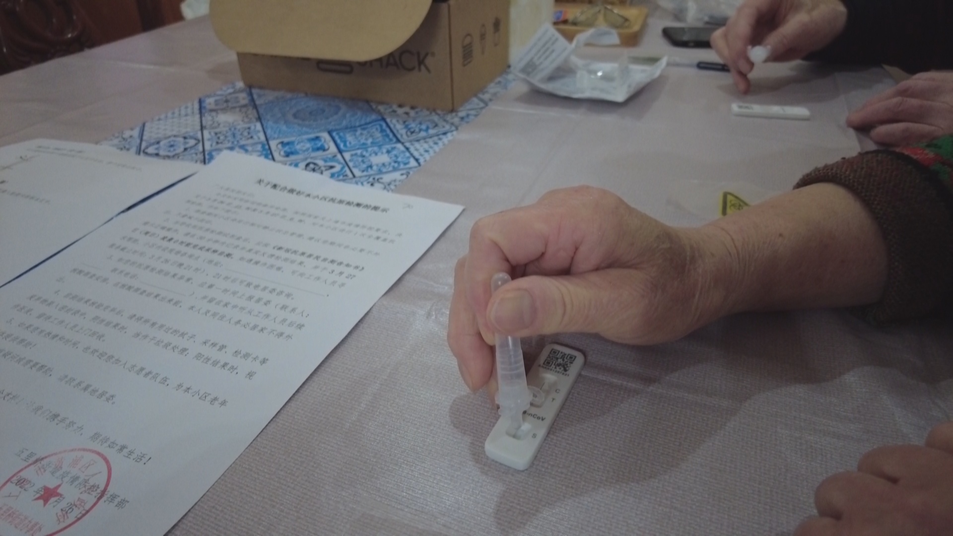 做完采样后,将鼻拭子放入采样管中挤压5次,随后滴4滴在检测卡的标本卡上,并用手机开始计时。15分钟后,两人的标本卡均显示为阴性,随后将所有废弃物装入密封袋进行处理。葛阿姨说,医生教得挺仔细,使用也很方便。