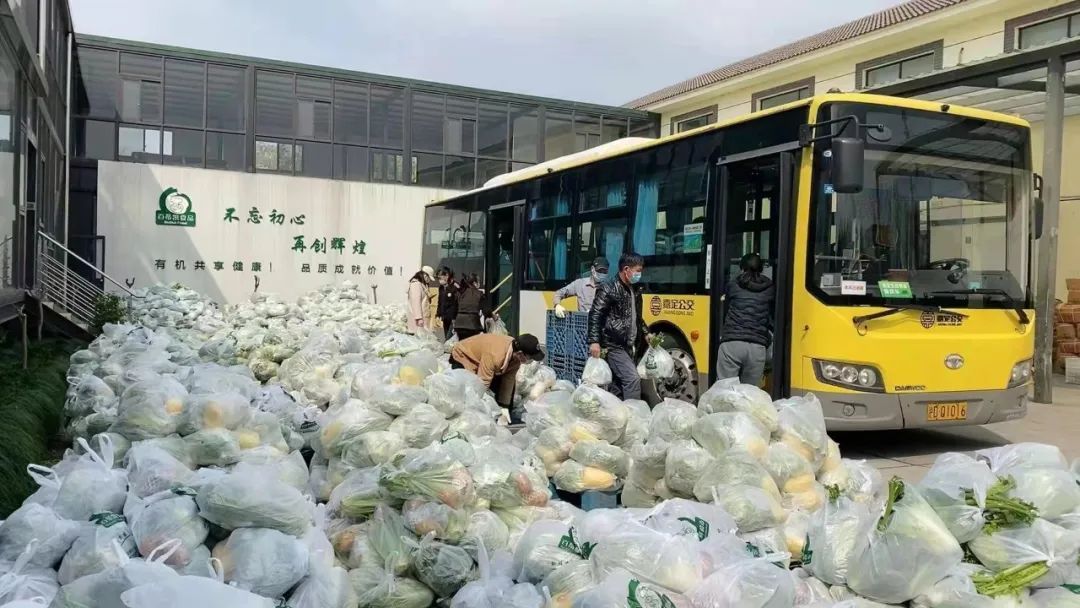 运输车辆不够,怎么办?区国资委协调调用了交发集团的公交车,开创新用途,为江桥、真新居民送菜。