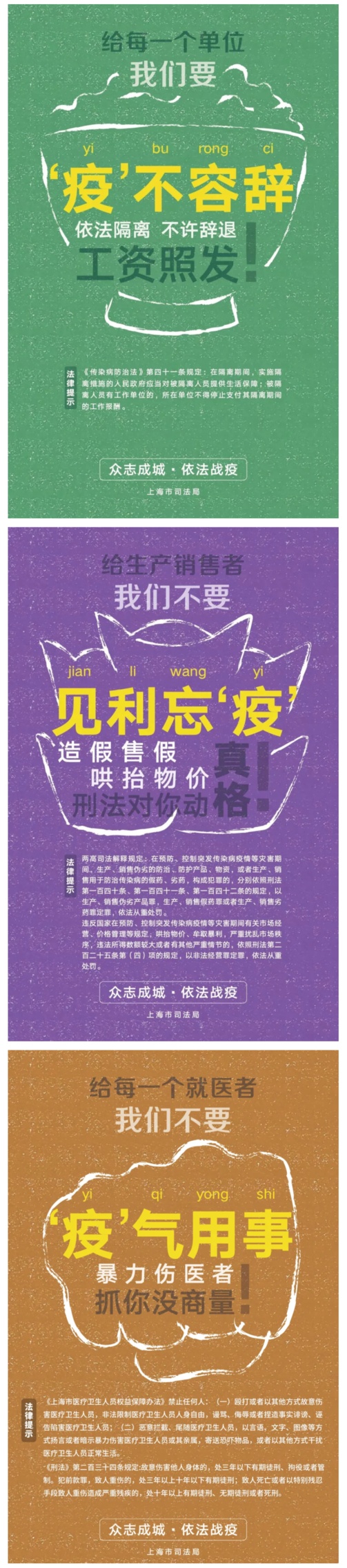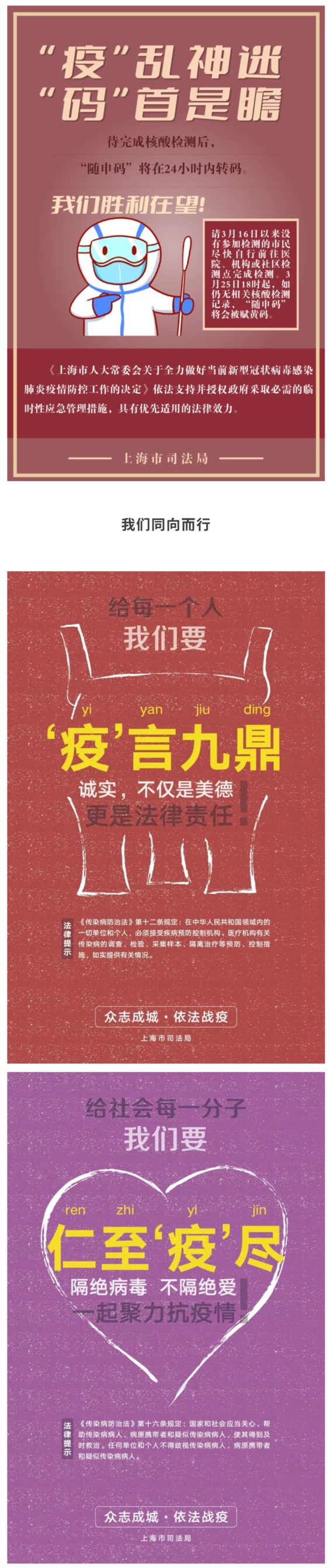市司法局介绍,让防疫成为一种责任,让守法成为一种习惯。“疫”言既出,驷马难追;应检尽检,不漏“疫”人;绿色出行,“疫”码当先;“疫”乱神迷,“码”首是瞻。收藏海报,正确依法防疫。详见↓