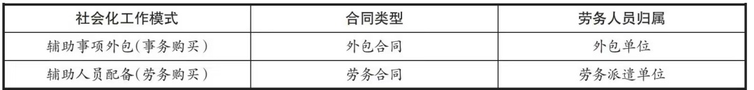 在确定了购买主体之后,如何开展辅助事务社会化的工作是落实该项机制的根本,即解决“怎么买”的问题。法院购买社会服务的对象最终体现于各项工作,而所有的工作终归由人实施。从上述不同地区法院的积极探索中可以看出,目前购买社会服务的模式有两种,一种是以辅助事项外包为模式即采用“事务购买”方式,一种是以辅助人员配备为模式即采用“劳务购买”方式。所谓“事务购买”是指法院根据审判辅助事务的具体事项,通过决策与外包单位签订合同或者合作协议,由外包单位再组织、安排辅助人员来履行相关事务;所谓“劳务购买”是指法院组织招聘或者提出辅助人员需求后,通过劳务派遣方式安排辅助人员履行相关审判辅助事务,而不局限于某一特定的辅助事项。总结归纳即 如表所示的工作模式: