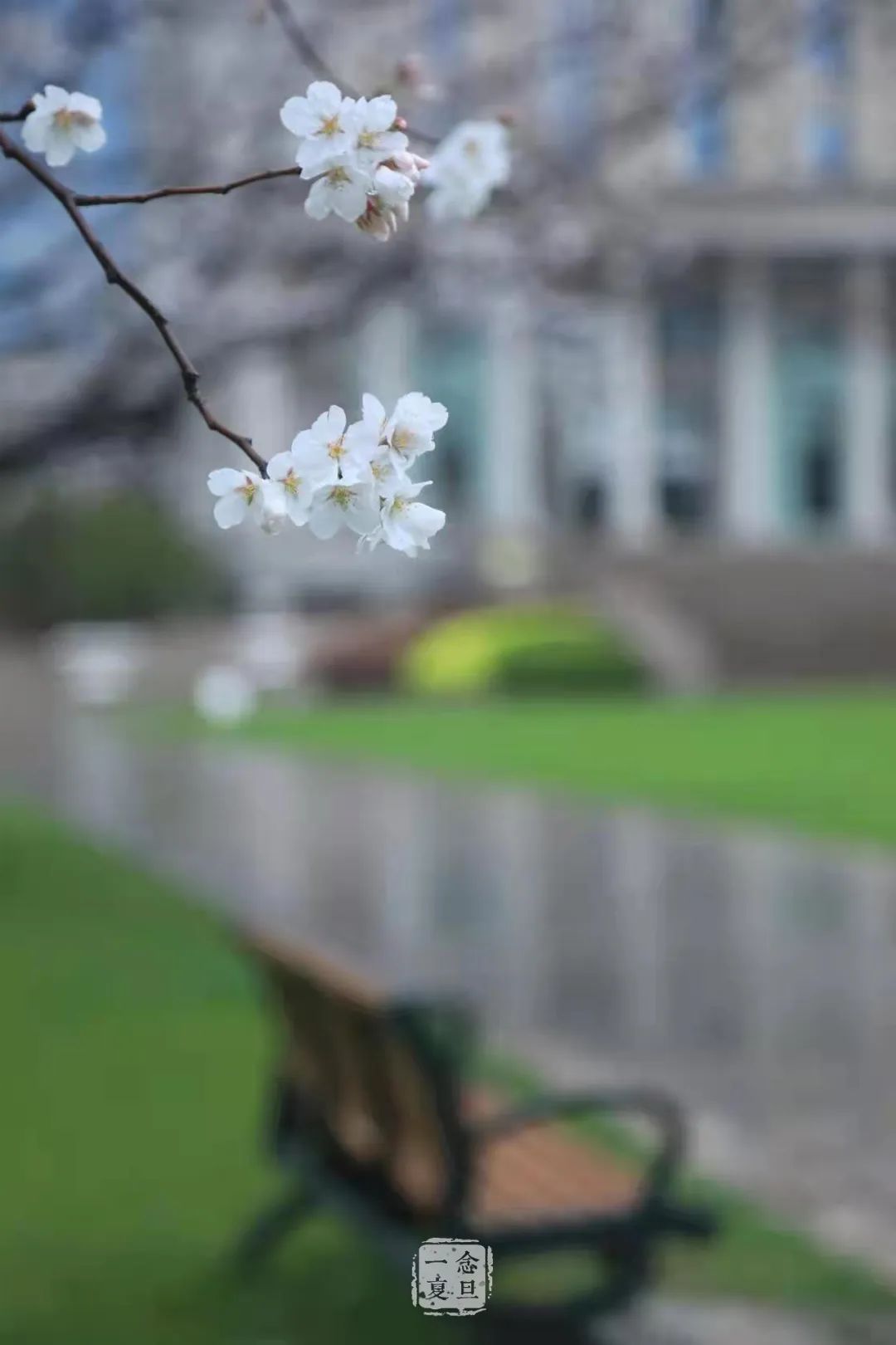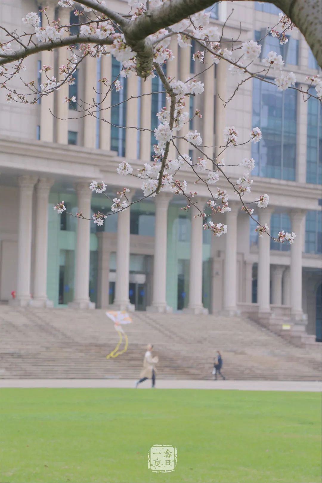 光华楼庄严的灰白和草地娇俏的嫩绿之间