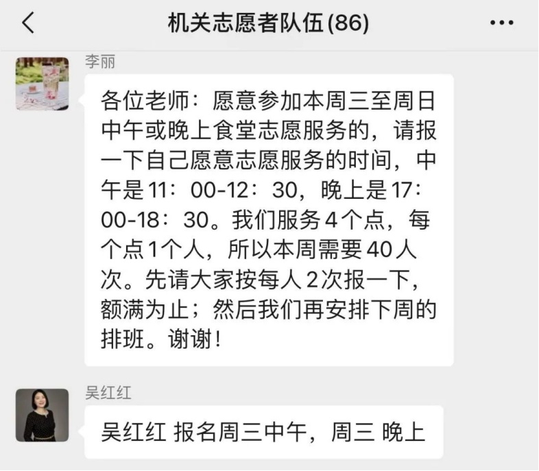 “周三中午、晚上,学生食堂,我报名!”“周四中午、晚上,体育馆,我报名!”这些天,在上海杉达学院机关志愿者队伍的微信群里,每天都有“争先恐后”领任务的一幕。