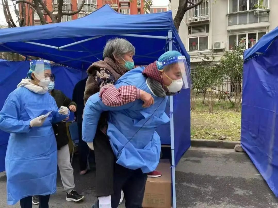 二工大体育部党支部教师刘强背着老人做核酸检测