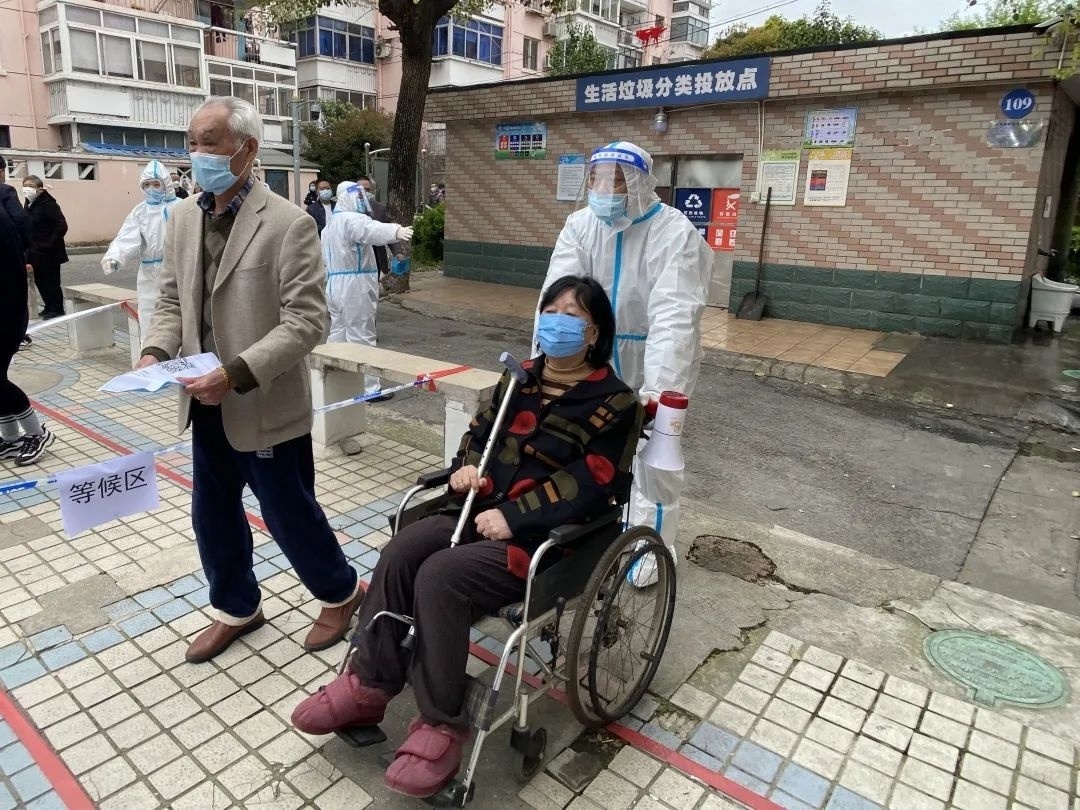 ▲临源居委会志愿者送老人前去做核酸