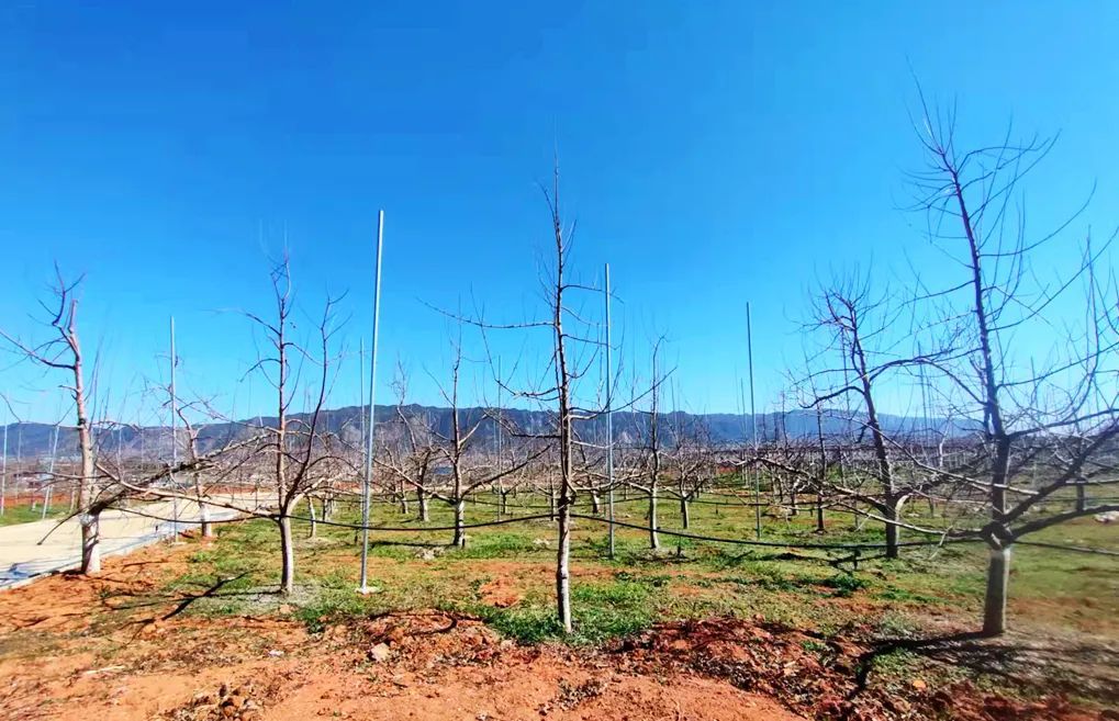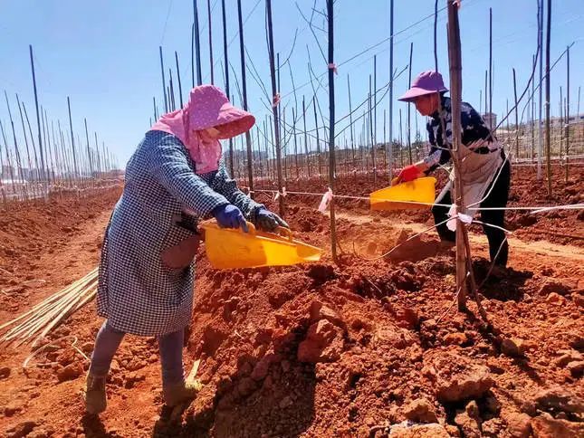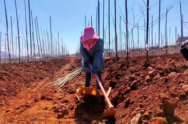 在宣威市霖森现代农业产业园里,成片的树木一望无际,工人们正给新栽的100多亩苹果苗盖土、浇水,进行树苗的春耕管理工作。