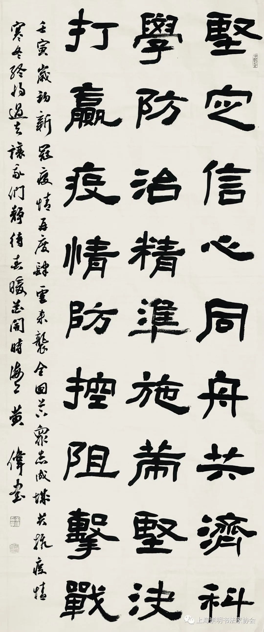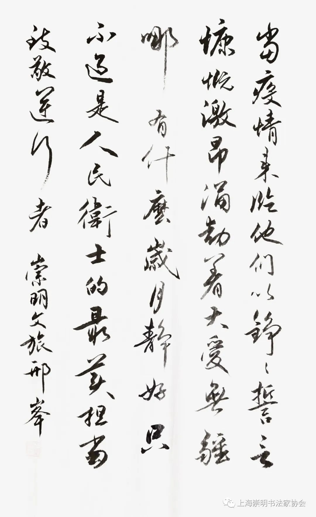 齐心抗疫,艺起行动。近期新冠疫情再次来袭,疫情防控正处在最紧要关头。崇明文艺届为凝聚抗疫力量,鼓舞抗疫斗志,开展了抗疫作品创作,推出一批内容生动、感人至深、鼓舞士气的战“疫”主题作品,以书法、绘画、摄影、诗歌、童谣等不同文艺形式,讴歌一线抗疫英雄,反映人民群众防控疫情的坚定决心和必胜信念,为打赢疫情防控阻击战凝聚强大正能量。