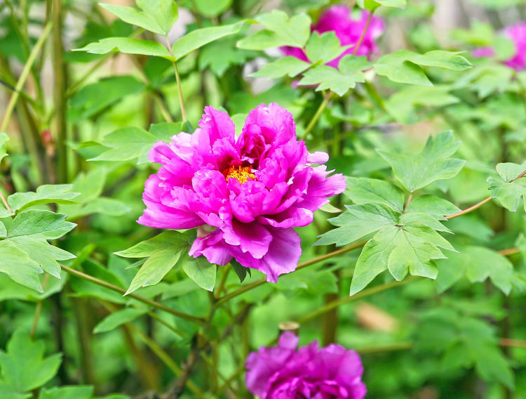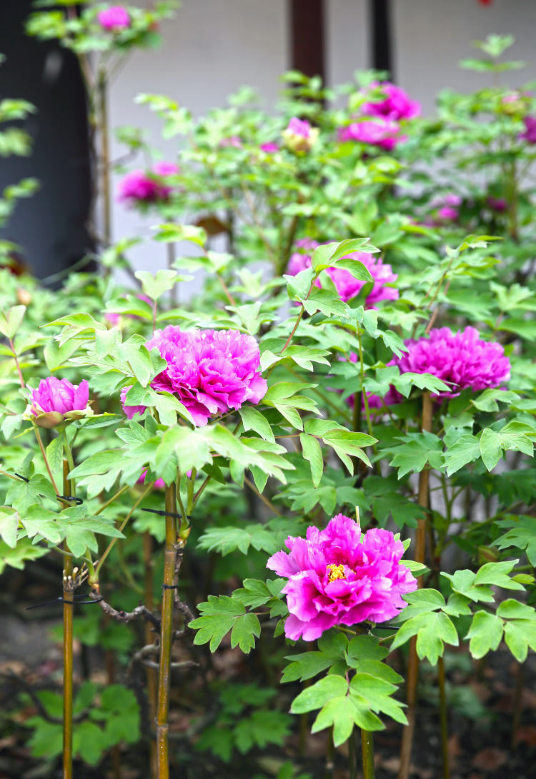 园内四面厅前,素有“花王”美誉的百年牡丹已初展芳容。记者看到,这株百年牡丹枝头已经缀满了大如碗口的紫红色花朵,花色艳丽,粉脸含春,粗略数来已有12朵,个个婀娜多姿,香气袭人,尽显“花王”风采。