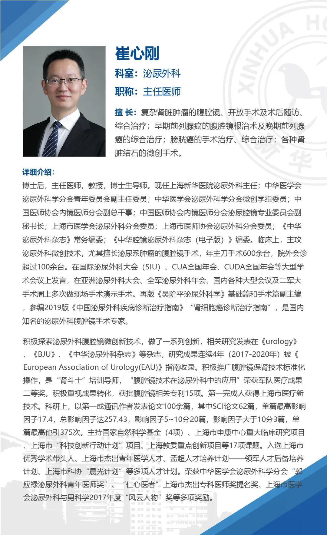 上海新华医院泌尿外科:是上海交通大学医学院重点学科和专科住院医师规范化培训基地。“一流技术、一流服务、病人第一”是科室的一贯追求和核心理念。科室现有核定床位67张,实际开放约90张。医生21人,其中高级职称16名,博士学位14名,博士研究生导师2名,硕士研究生导师8名。目前科室设有肾脏肿瘤,膀胱肿瘤,前列腺癌,泌尿系结石,前列腺增生男科尿控五个亚专业。诊治范围涵盖了几乎所有的泌尿、男生殖系统常见疾病。泌尿外科承担了住院医师培训教学任务,泌尿专科医师培训教育以及两项国家级继续教育项目学习班(尿路重建和泌尿系统结石的微创治疗),培养了大批医疗人才。泌尿外科现是上海交通大学医学院临床教学示范病区,2012年还被评为上海交通大学医学院优秀教学团队。目前与美国哈佛大学等多所国外著名医疗机构建立了密切的协作关系,在膀胱癌、前列腺癌、良性前列腺增生以及泌尿系结石的基础和临床研究等方面取得了丰硕成果。