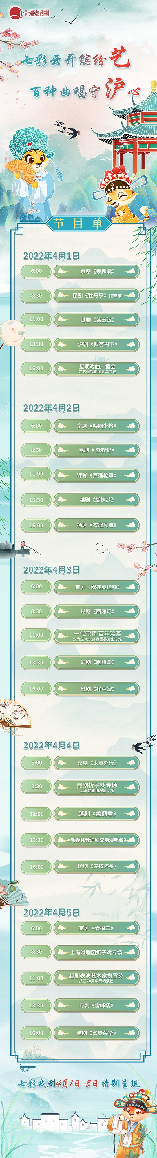 七彩戏剧频道在4月1日至5日期间将推出《七彩云开缤纷“艺” 百种曲唱守“沪”心》特别版面,选取京、昆、越、沪、淮、评弹、扬剧等剧种的经典大戏,陪伴戏迷朋友共度特殊时期。