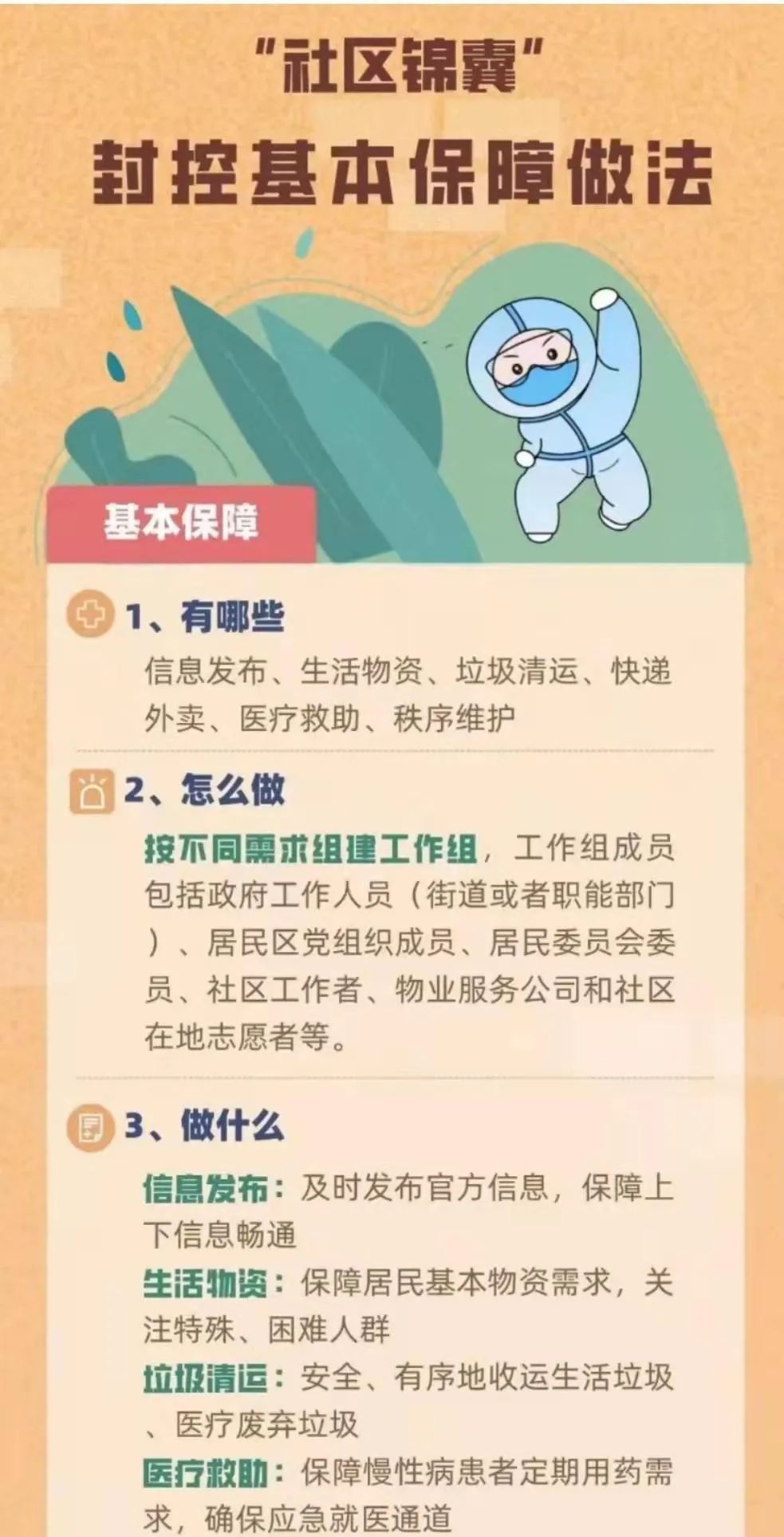 社区封控基本保障做法主要有三方面内容:一是基本保障有哪些、做什么、怎么做。例如,按照不同需求建立工作组,工作组成员包括政府工作人员、居民区党组织成员、社区工作者、物业服务公司和社区在地志愿者等,分别负责信息发布、生活物资、垃圾清运、医疗救助、快递外卖、秩序维护等各项工作。