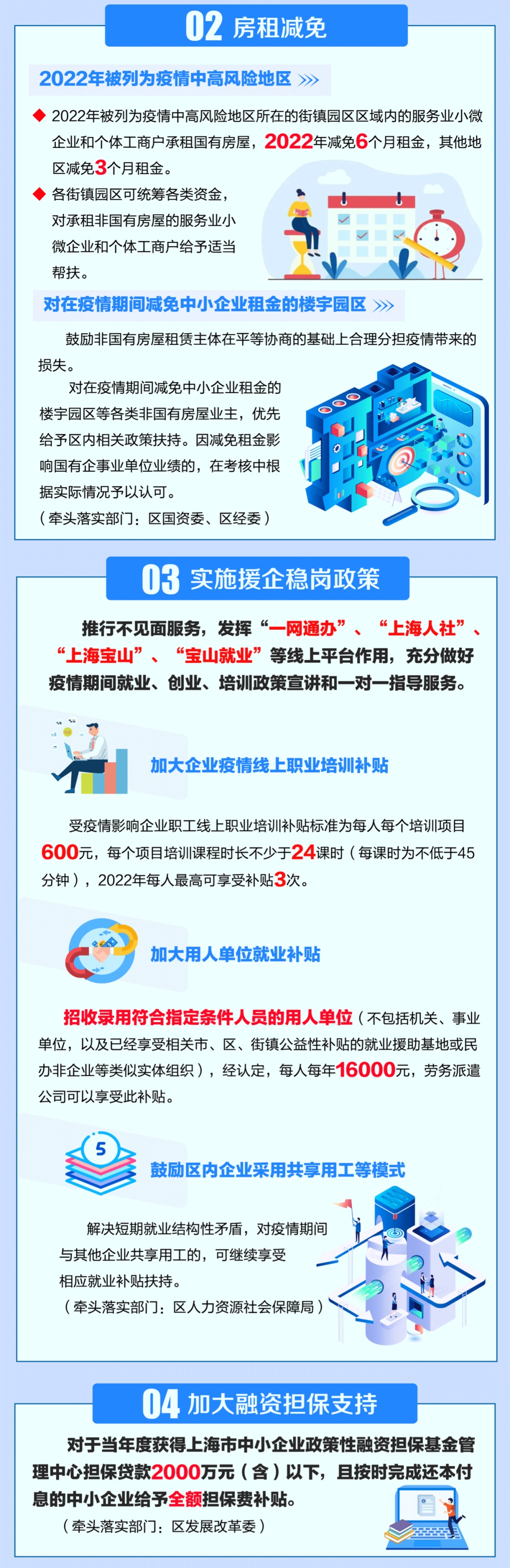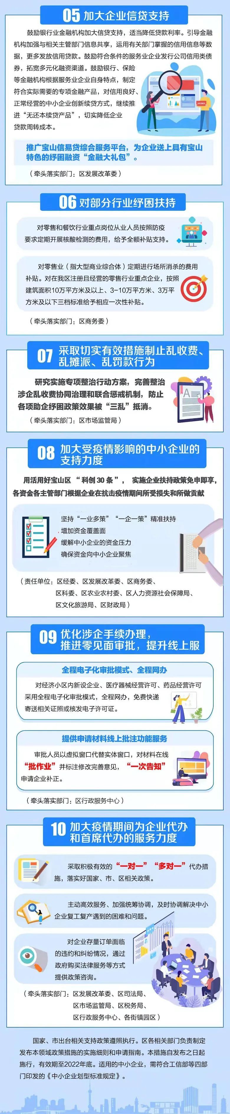 宝山区制定了《宝山区全力抗击疫情助企纾困的十条措施》,包括实施税收优惠、房屋减免、加大融资担保支持、加大企业信贷支持等十方面政策措施,详见↓