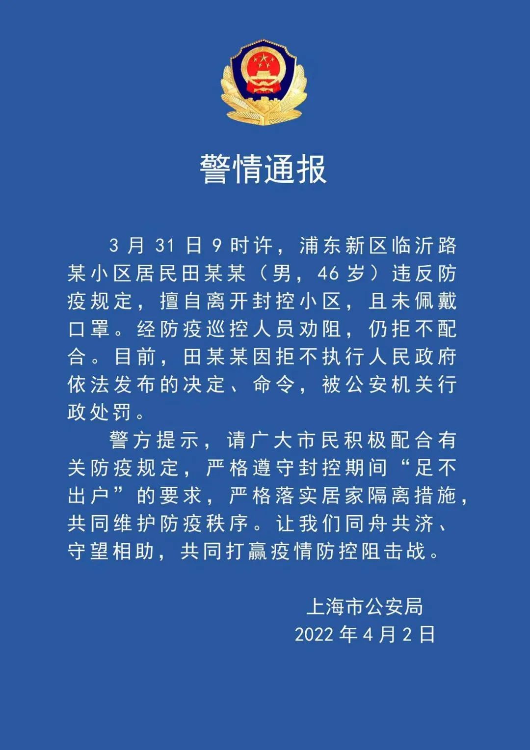 市公安局通报,3月31日9时许,浦东新区临沂路某小区居民田某某(男,46岁)违反防疫规定,擅自离开封控小区,且未佩戴口罩。经防疫巡控人员劝阻,仍拒不配合。目前,田某某因拒不执行人民政府依法发布的决定、命令,被公安机关行政处罚。