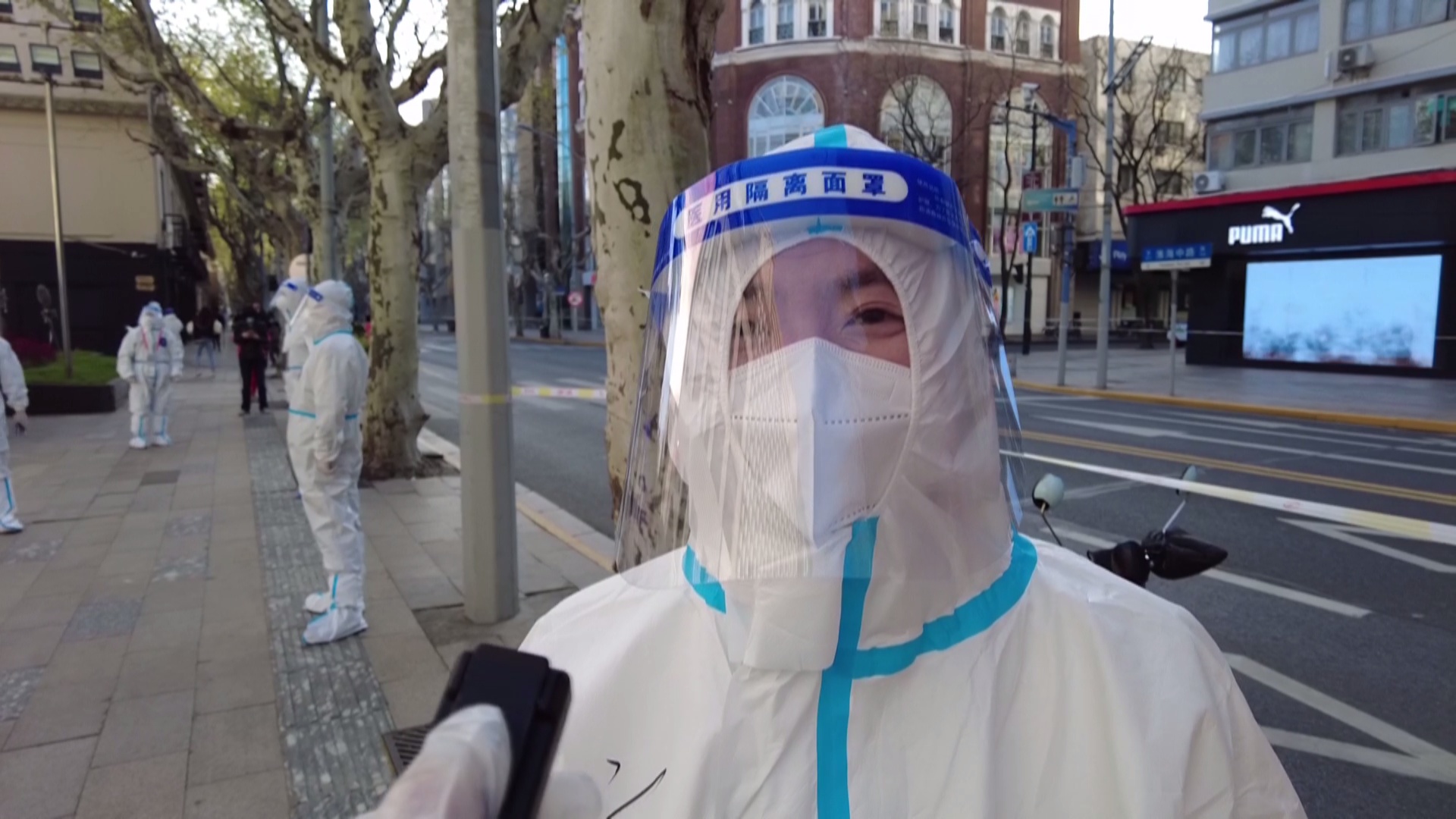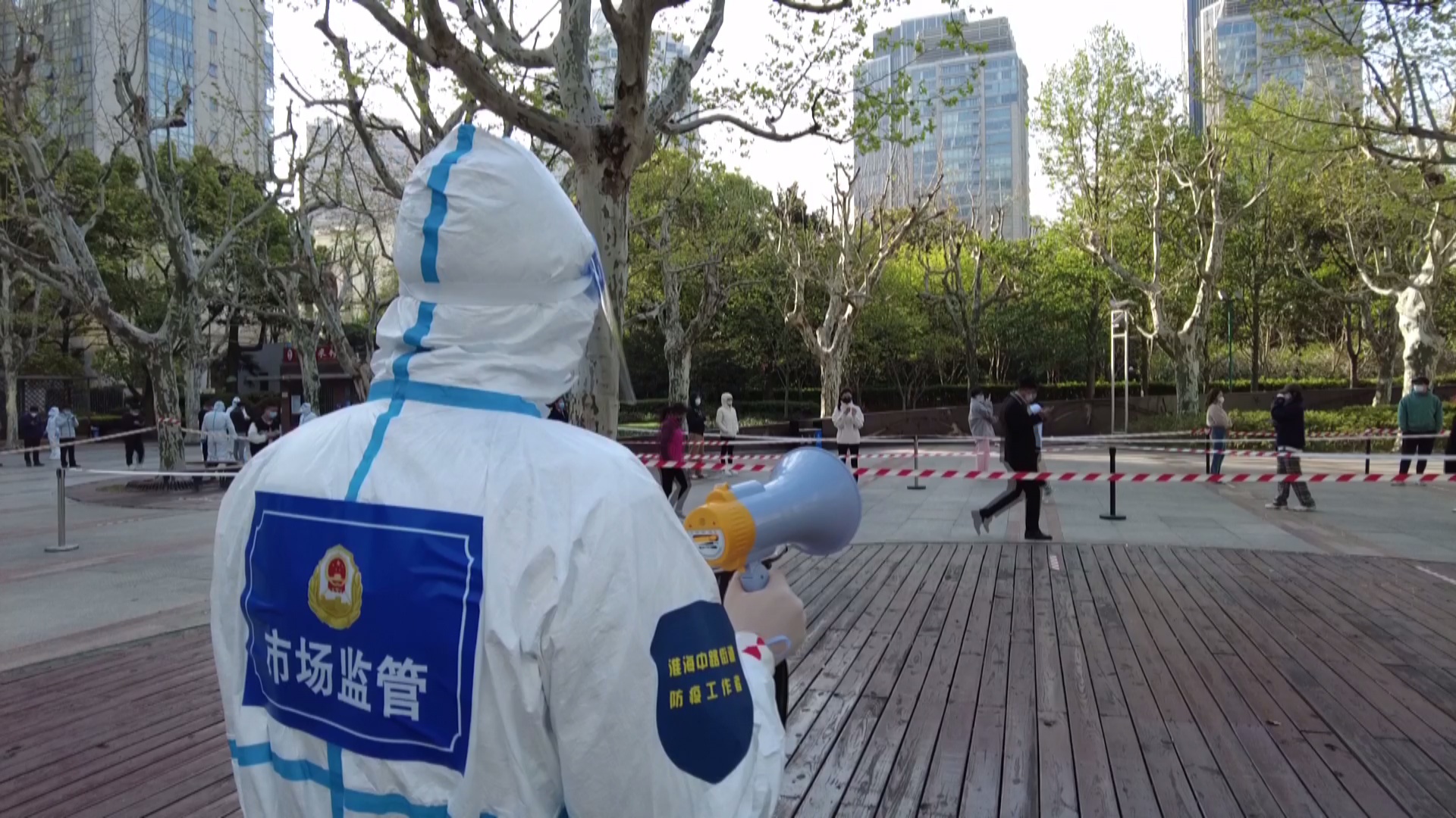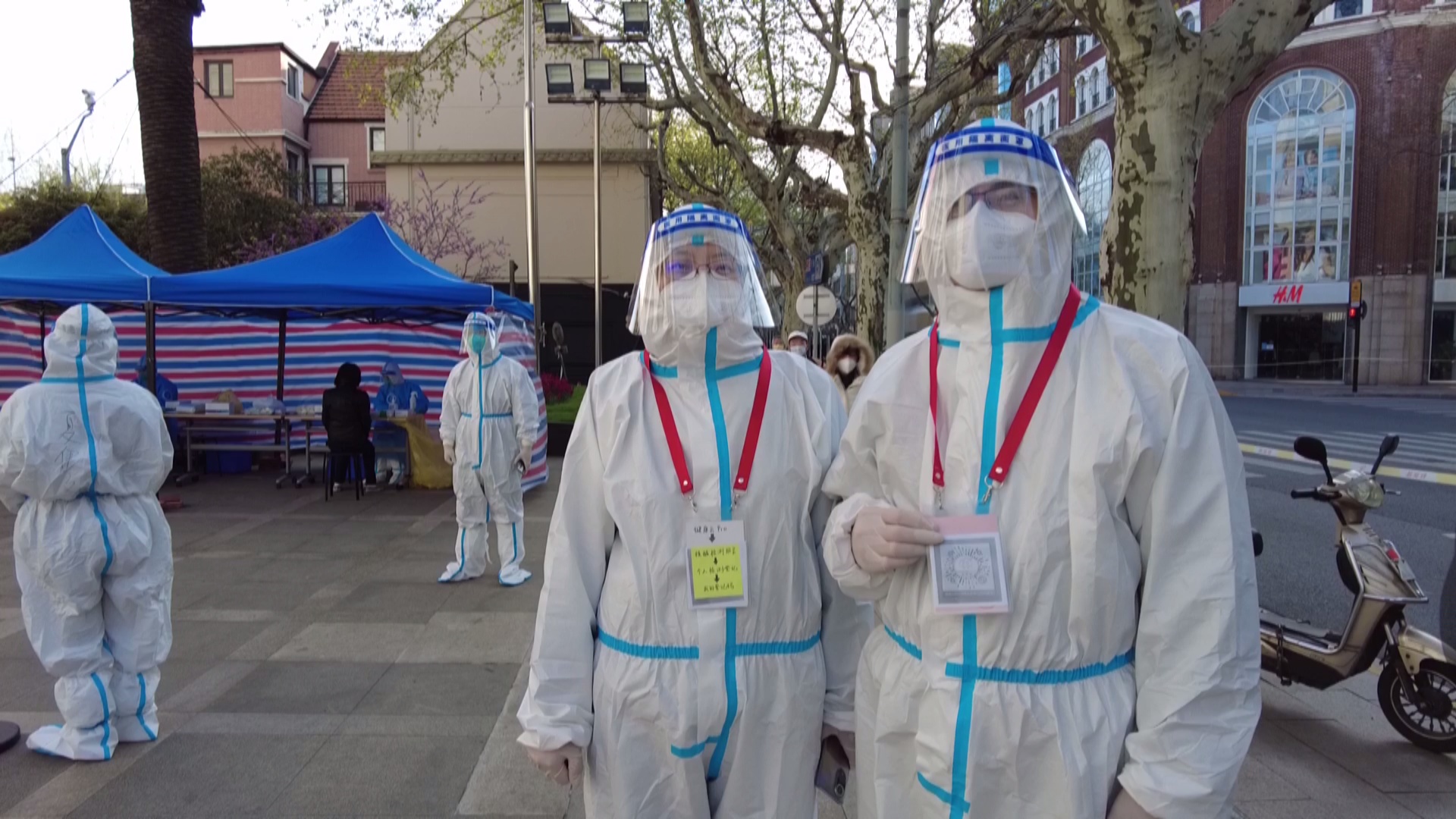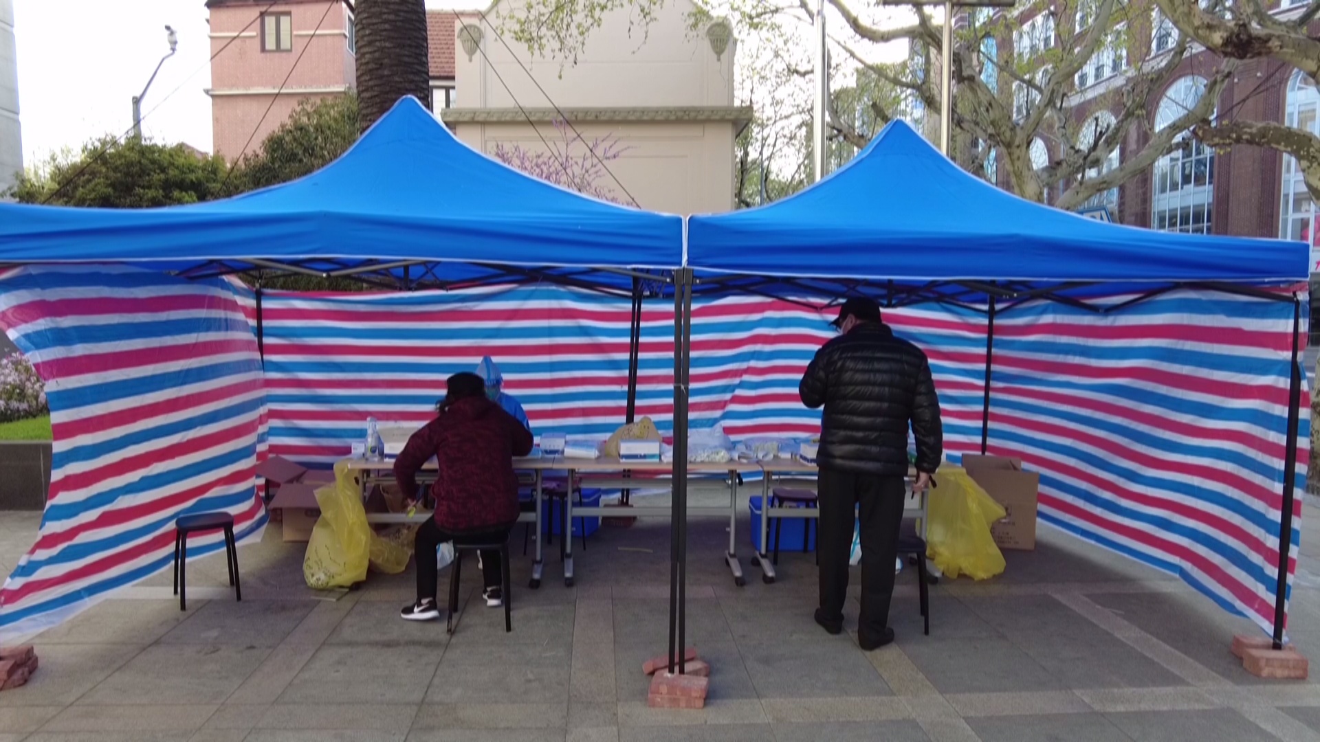 一旁七十岁的志愿者告诉记者,今天做核酸,老人家里没有子女陪,所以自己来帮助她,一起来做核酸,老人的子女都不在身边,都被封在外面。她一个人, 现在烧饭吃的什么都是我帮助她烧。