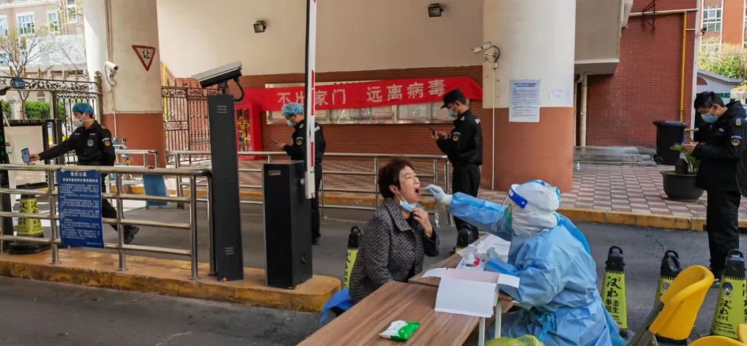 采样时,居民们逐一上前检测。采样结束后,根据居民楼位置不同,志愿者指引居民分不同通道赶紧回家,不时提醒大家不要在小区逗留或闲逛。