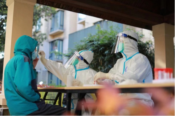 租客们也积极配合,严格遵守防疫要求,测完即走,不逗留。约一个半小时,450余名租户全部检测完毕。