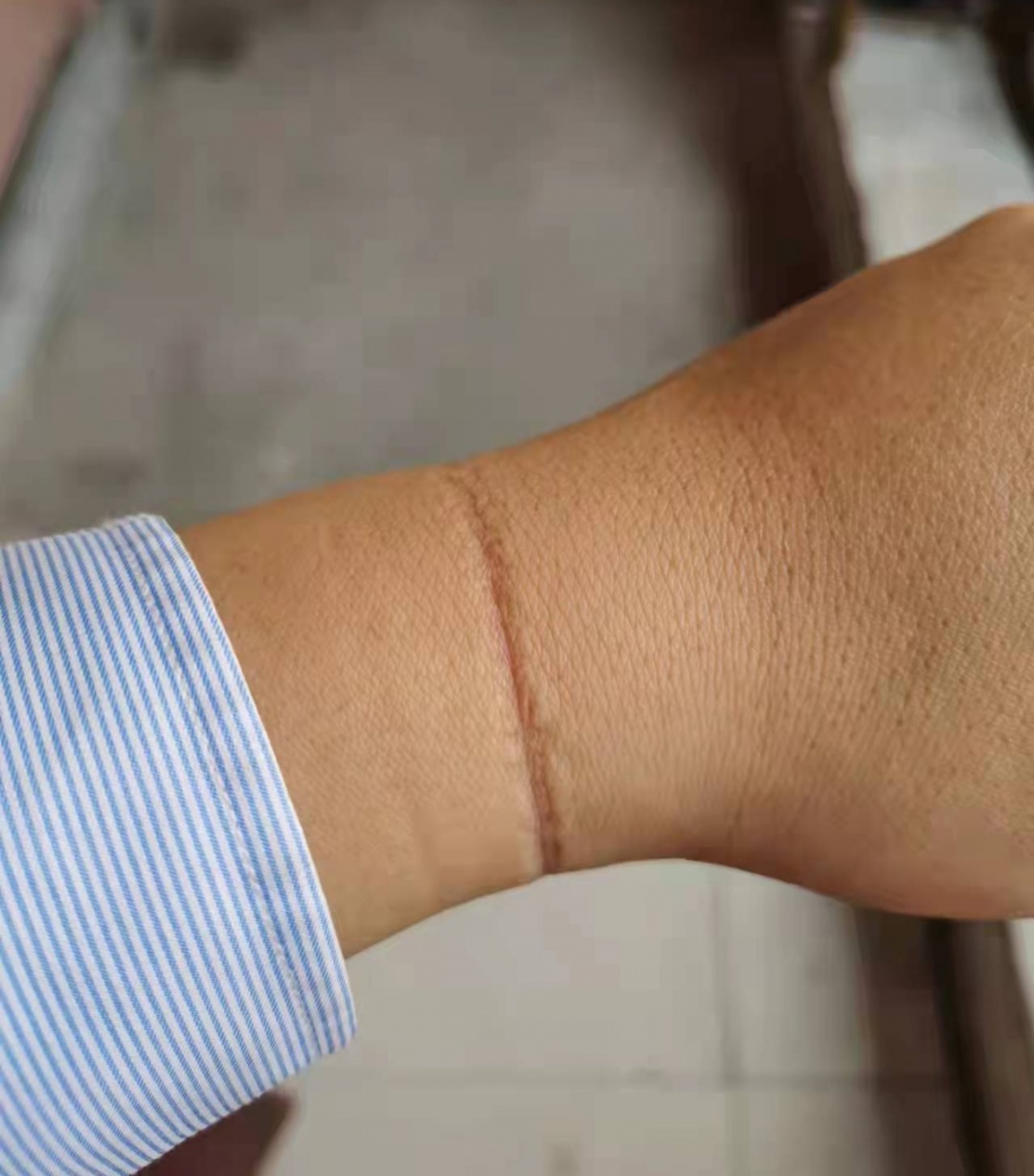 3月31日,东方网党办的迟主任做好单位大楼封闭期间的准备工作后回到松江,立刻投入到社区志愿服务工作中。长时间穿着防护服,两个手腕上留下了深深的印记。