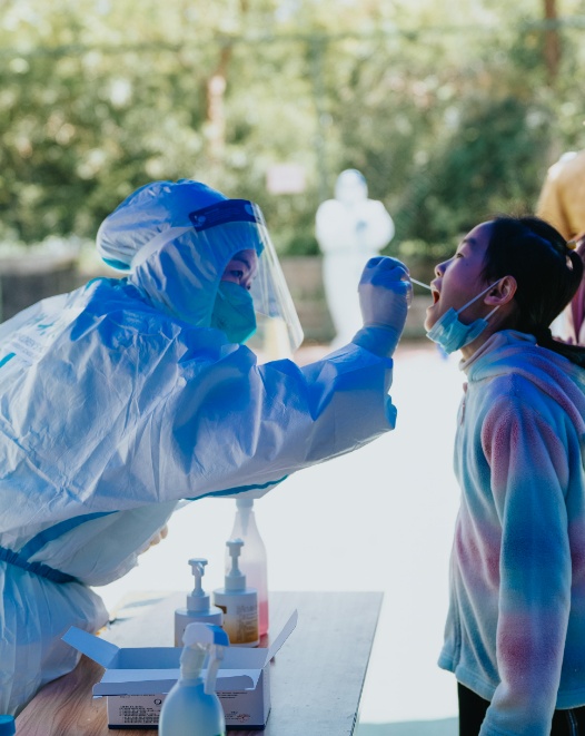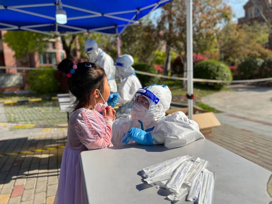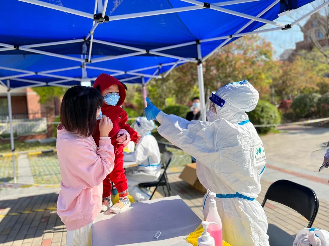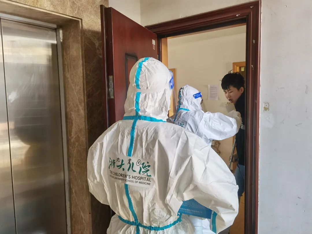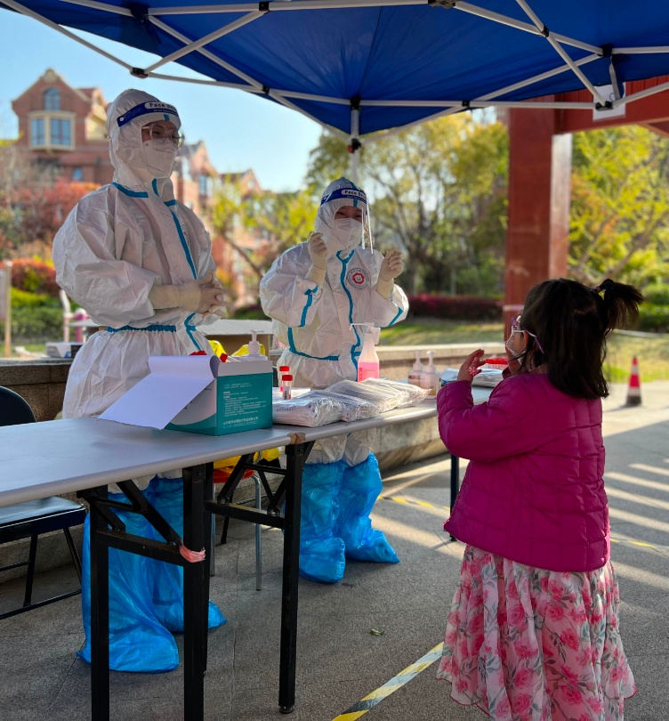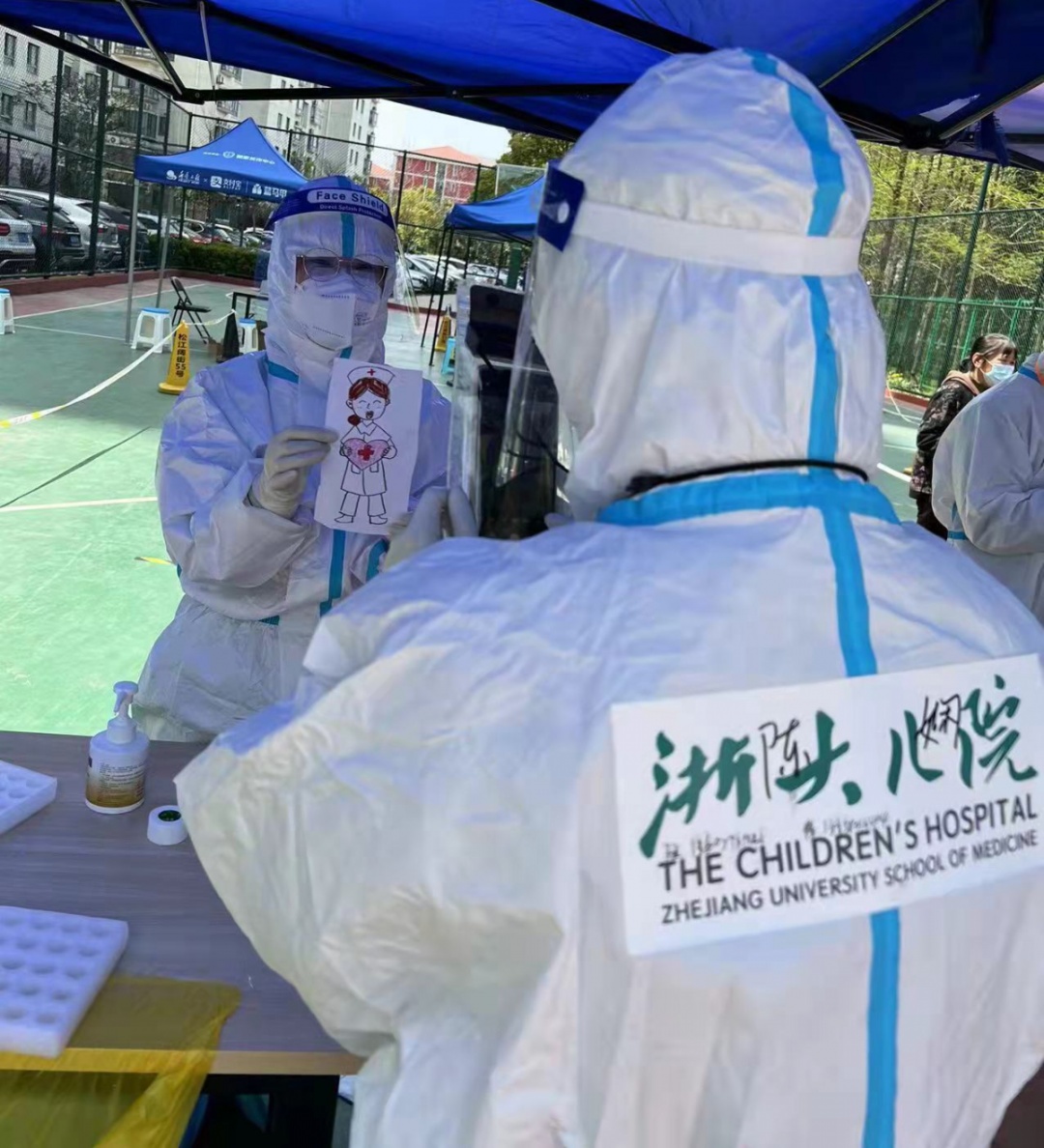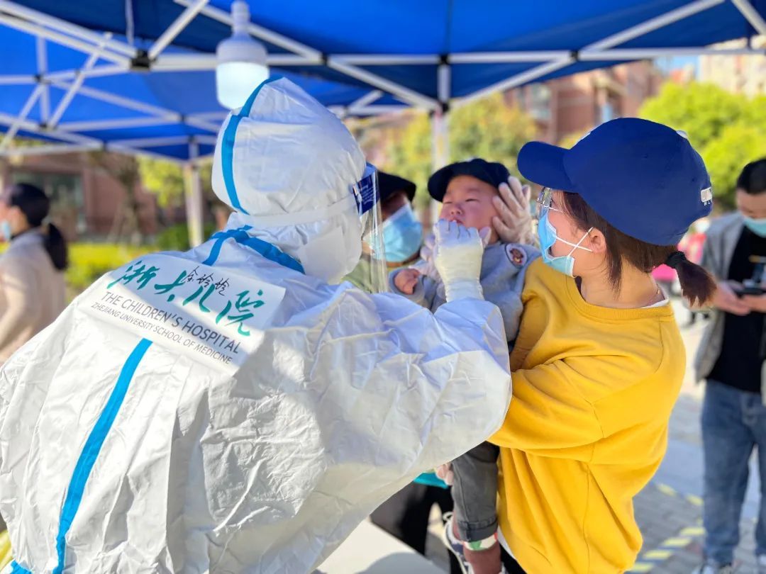 4月4日清晨,天还没亮,浙江大学医学院附属儿童医院的援沪医疗队便早早出发,从杭州赶来。6时30分,他们准时到达广富林街道各社区核酸采样点,立马就投入到了核酸采样工作中。“来,张嘴。”儿院医生们娴熟地忙碌着核酸采样工作,采样过程中遇到因恐惧而不配合的小朋友,他们便俯身“跪地”,温柔地鼓励安抚。