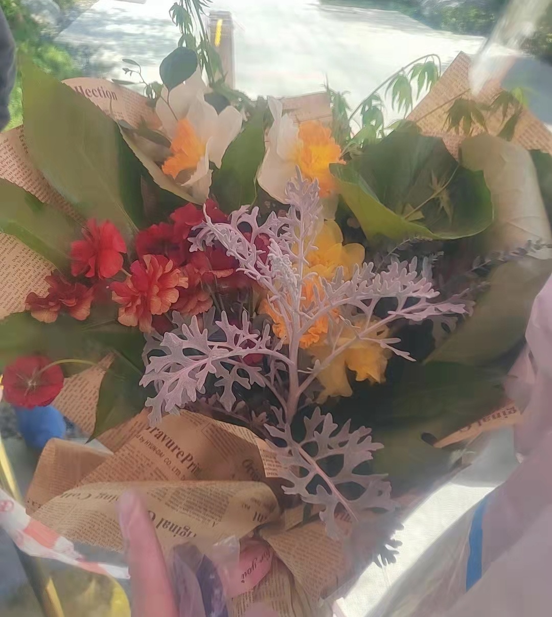 银泽社区的居民们采摘了各自花园里不同的鲜花包装起来送到医护人员手中