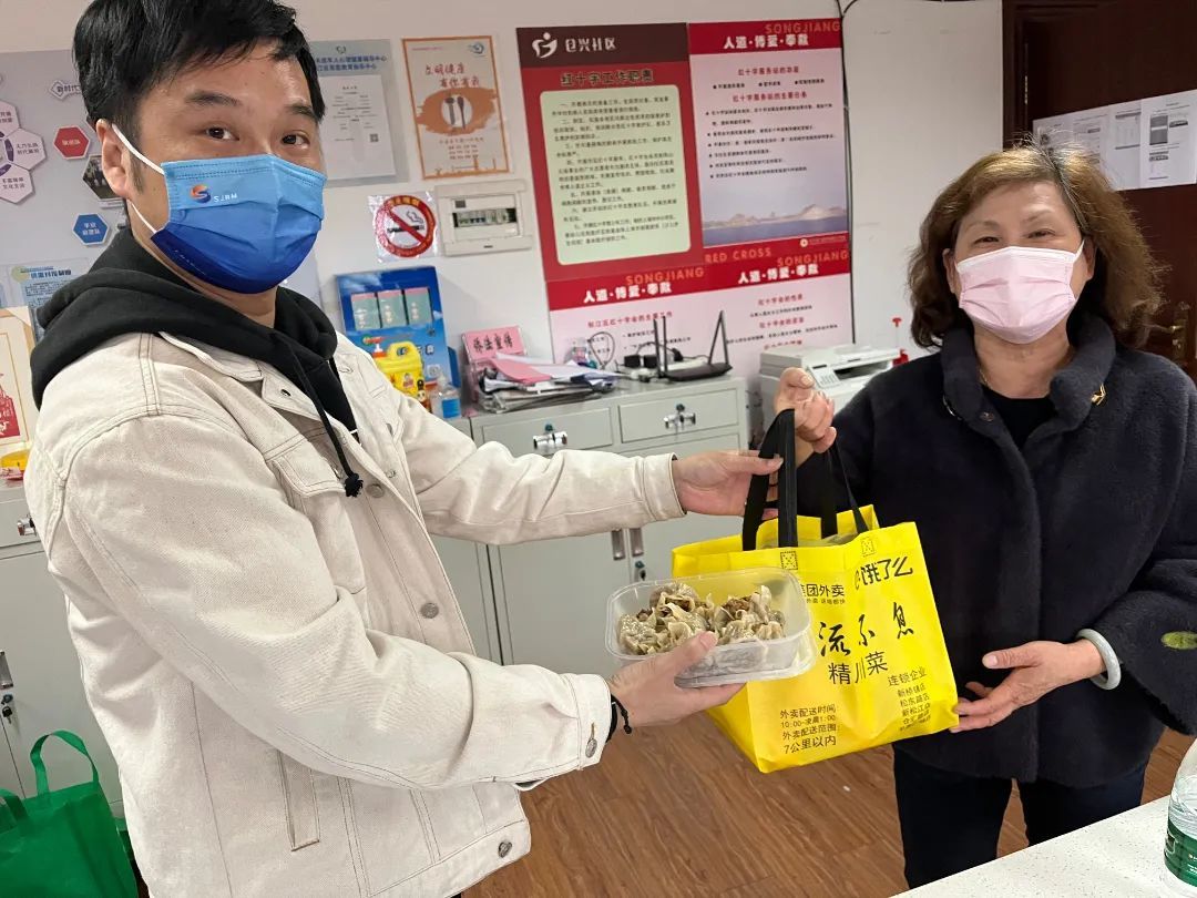仓兴社区的居民将亲手包的烧卖送到社区工作人员手中