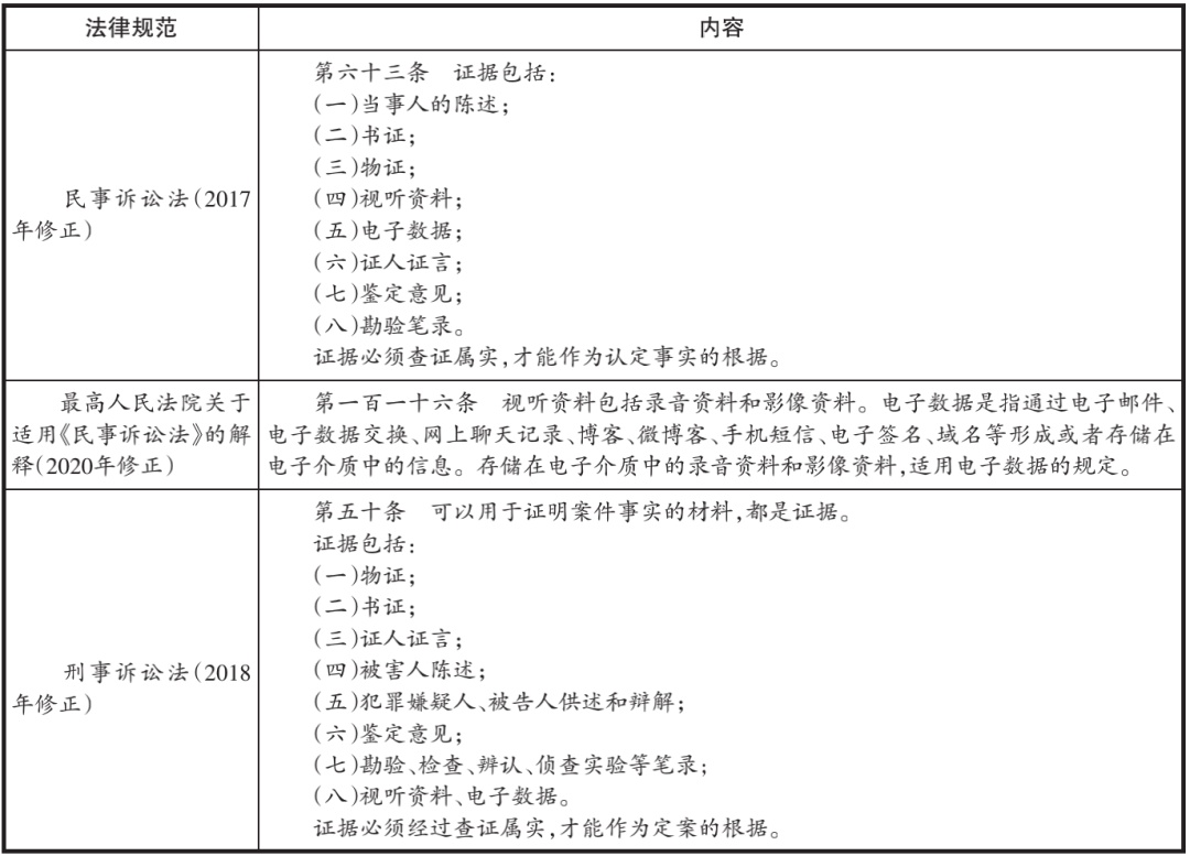 2012年之前,我国还未将电子数据规定为独立的证据取手段。自2012年起,全国人大常委会修改了民事诉讼法刑事诉讼法,以及在2014年修改的行政诉讼法中分别在第63条、第48条、第33条明确了电子数据作为新的证据种类的法律地位,由此在我国三大诉讼法中确立了其作为证据种类的法律效力。
